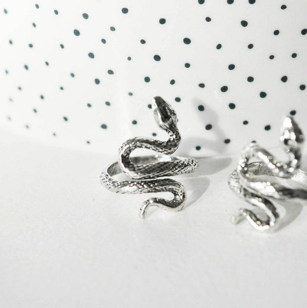 Precioso porta anillos regulable en metal zamac plateado con motivo trabajado en forma de serpiente.