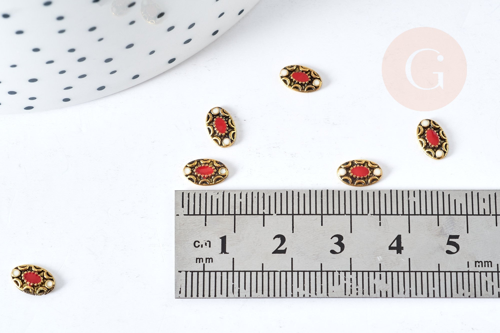 Charm EP para pegar ovalado zamac bronce esmalte blanco rojo 8mm, x5 (G8572)