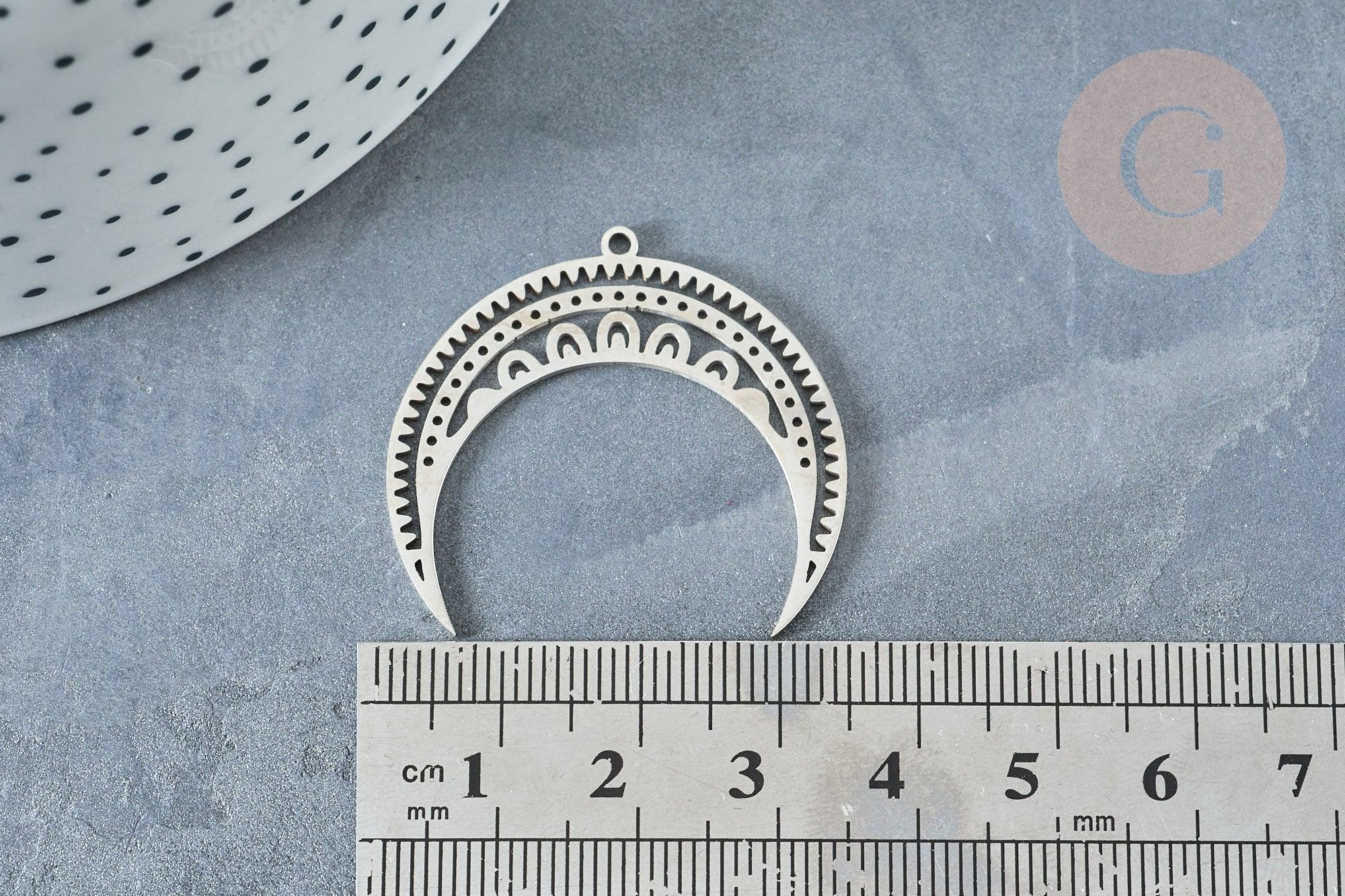 Para tus joyas con temática de constelaciones , aquí tienes un adorable colgante de plata en forma de luna con motivos de estrellas ahuecados en acero platino , que puedes adornar con una piedra o perlas.