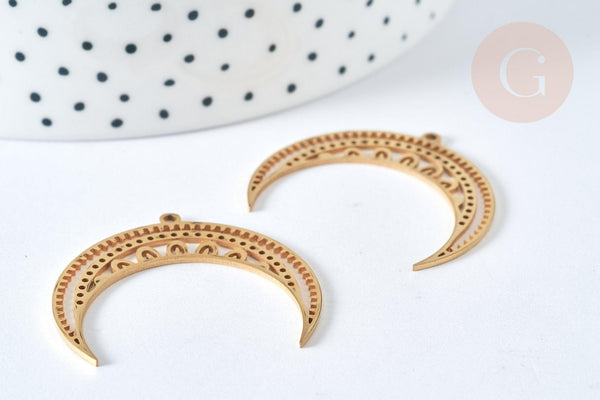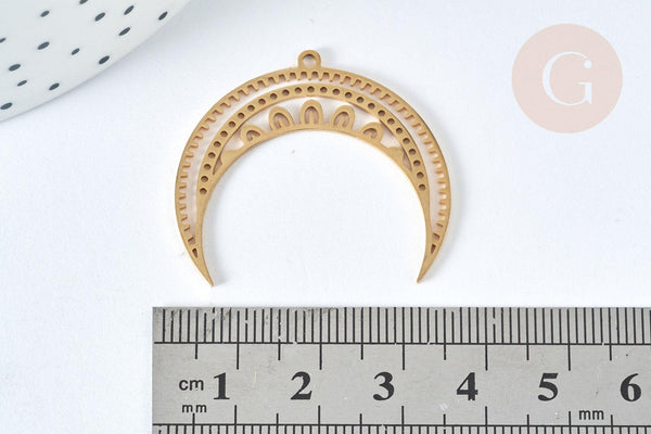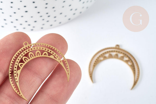 Para tus joyas de tendencia estelar, aquí tienes un adorable colgante en forma de luna ahuecado con dibujos de estrellas en acero bañado en oro, que puedes adornar con una piedra o perlas.