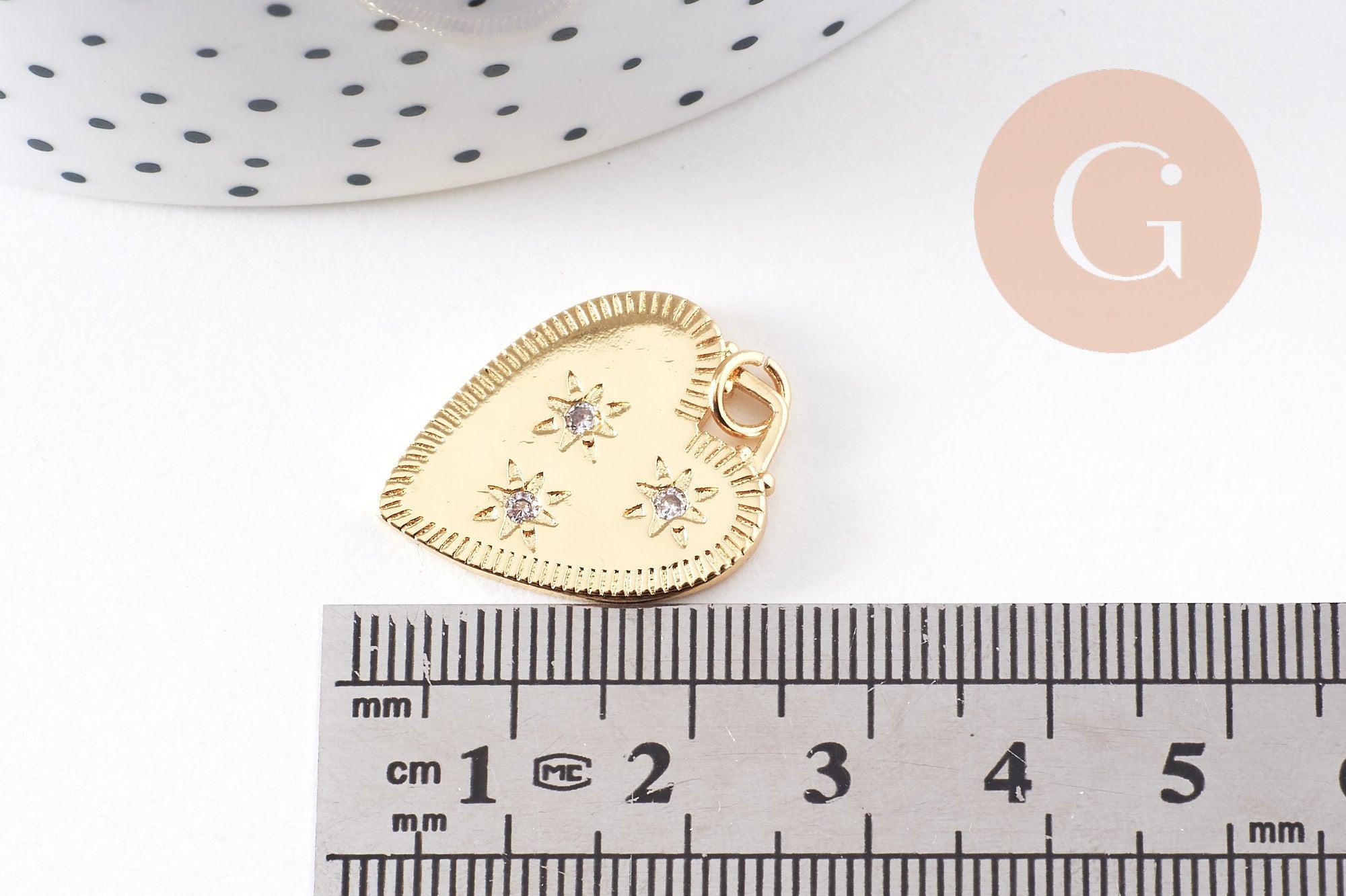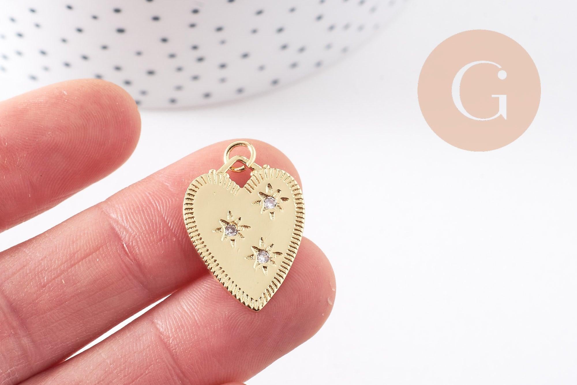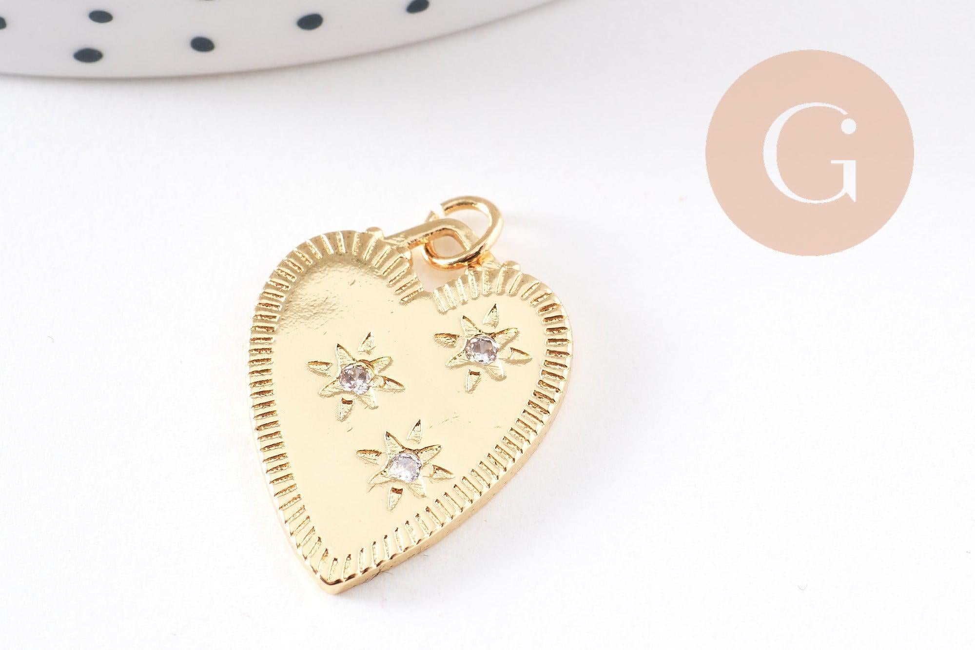 Aporta un toque de elegancia y sentimentalismo a tus diseños con nuestro colgante de corazón dorado que presenta un corazón en latón dorado y adornado con circonitas brillantes.