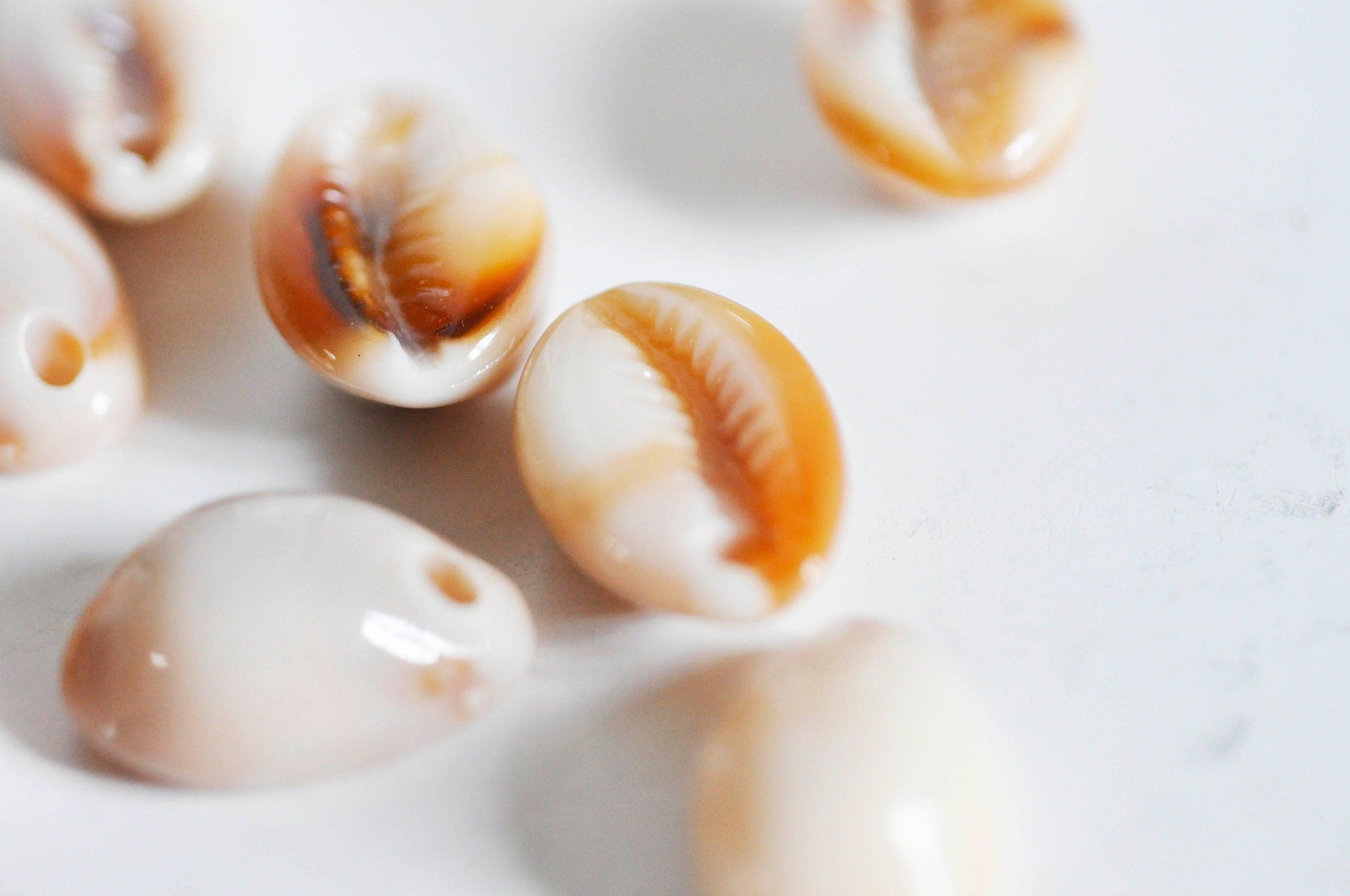 Un juego de 10 conchas de cauri acrílicas teñidas para hacer colgantes, pulseras y pendientes sobre el tema de las conchas.