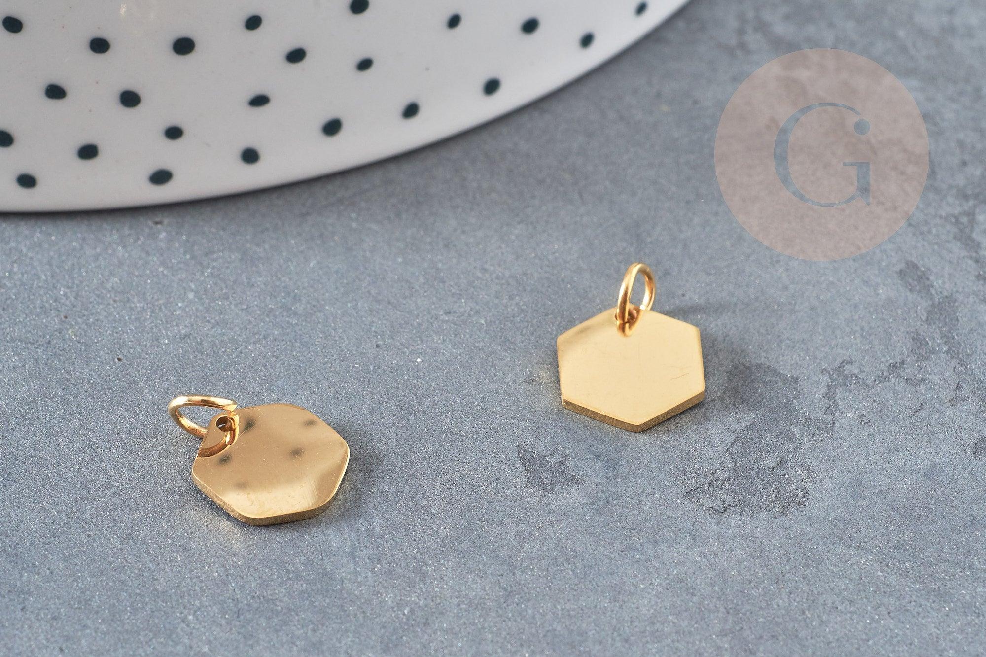 Un pequeño colgante geométrico de diseño moderno, perfecto para tus creaciones minimalistas. Con forma de hexágono plano, está elaborado en acero inoxidable hipoalergénico chapado en oro 201 con un hermoso y duradero baño de oro.
