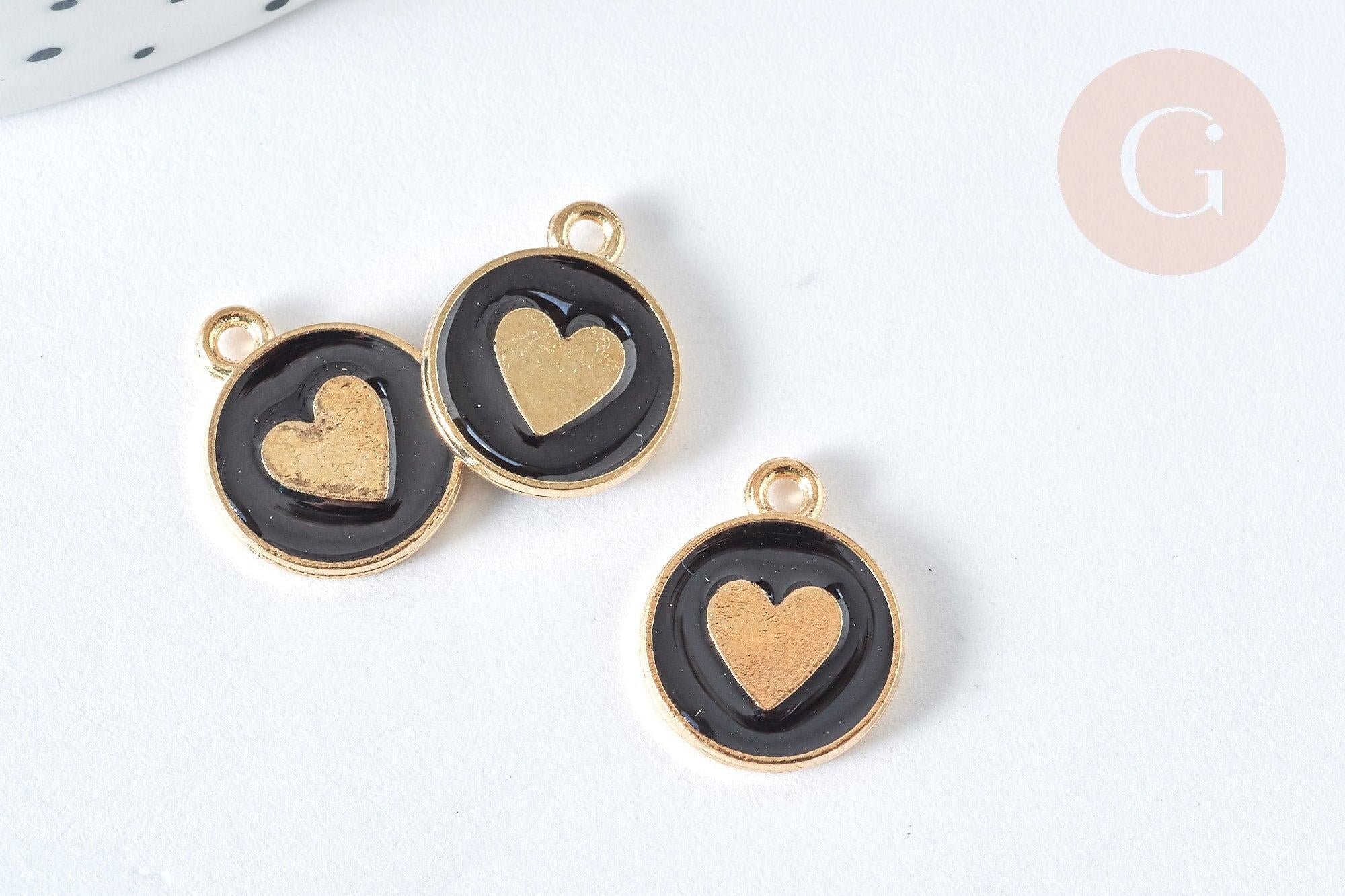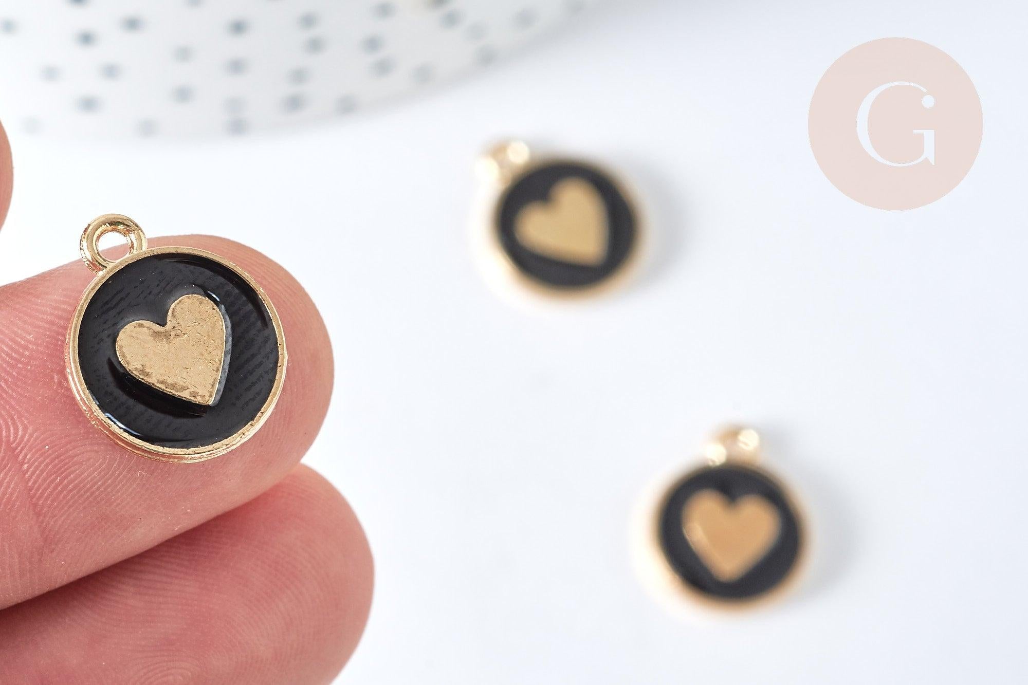 Pendentif médaille rond cœur émail noir zamac doré, création bijou amour, x1 (G7421)