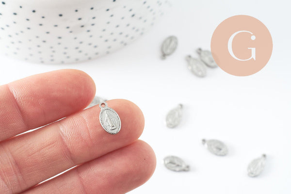 La Medalla Milagrosa de acero inoxidable tiene un acabado brillante y mide 12 mm de altura, perfecta para llevarla como colgante o para complementar una pulsera de dijes.