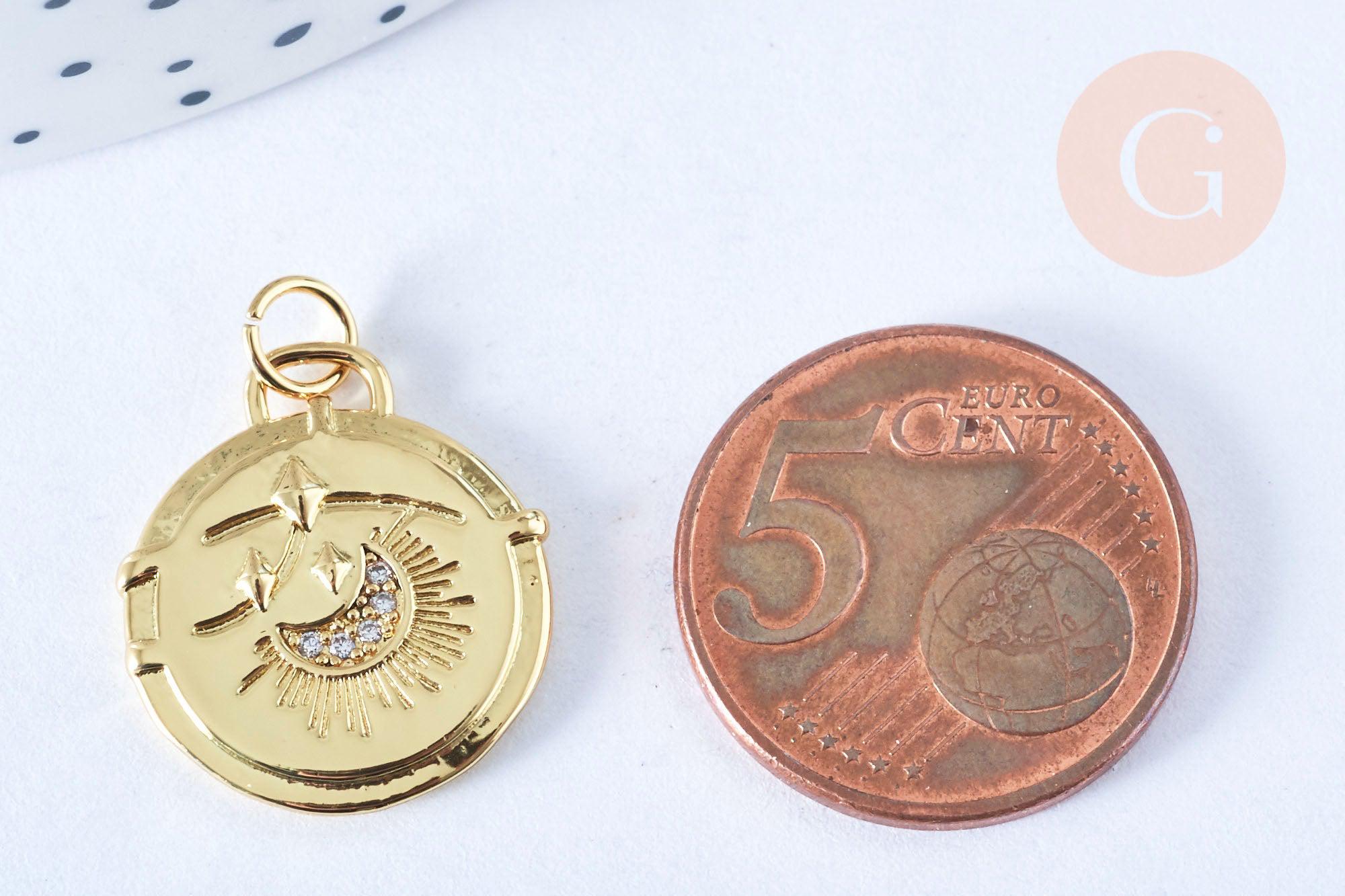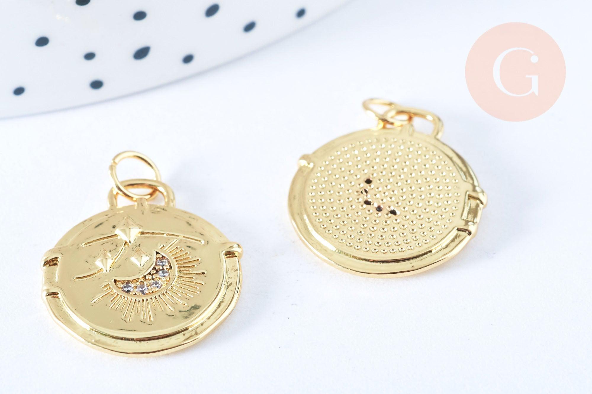 Para hacer magníficos collares y pendientes, esta adorable medalla redonda de la suerte en esmalte de latón bañado en oro de 18 quilates, decorada con una luna mística y un cristal de circonita.