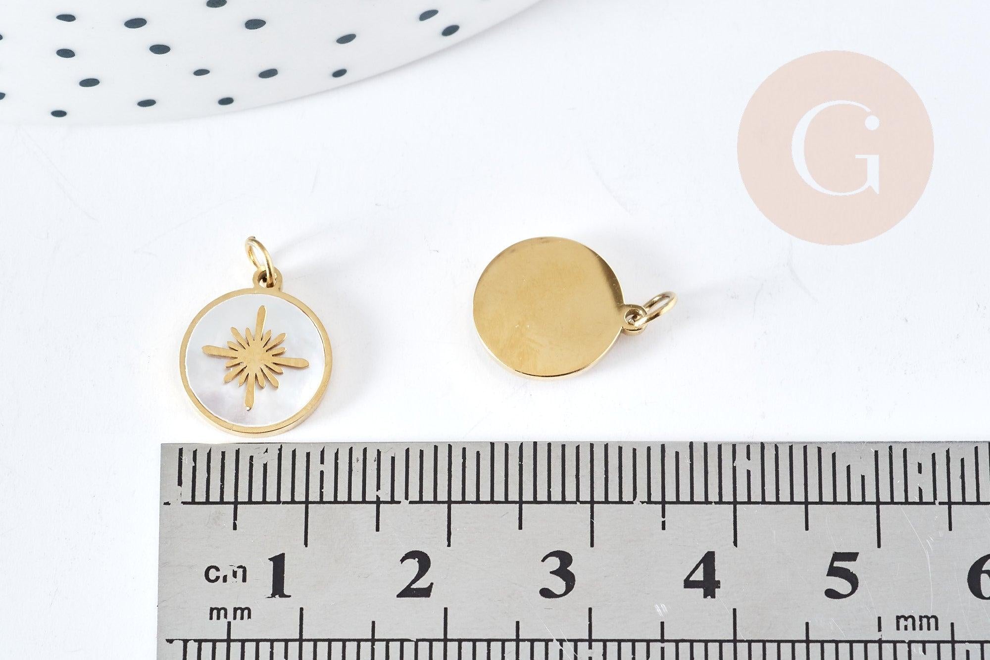 Colgante de sol redondo de nácar en acero inoxidable 316L, bañado en oro, 12,5 mm, x1 (G8773)