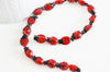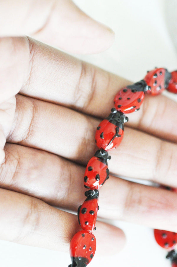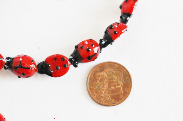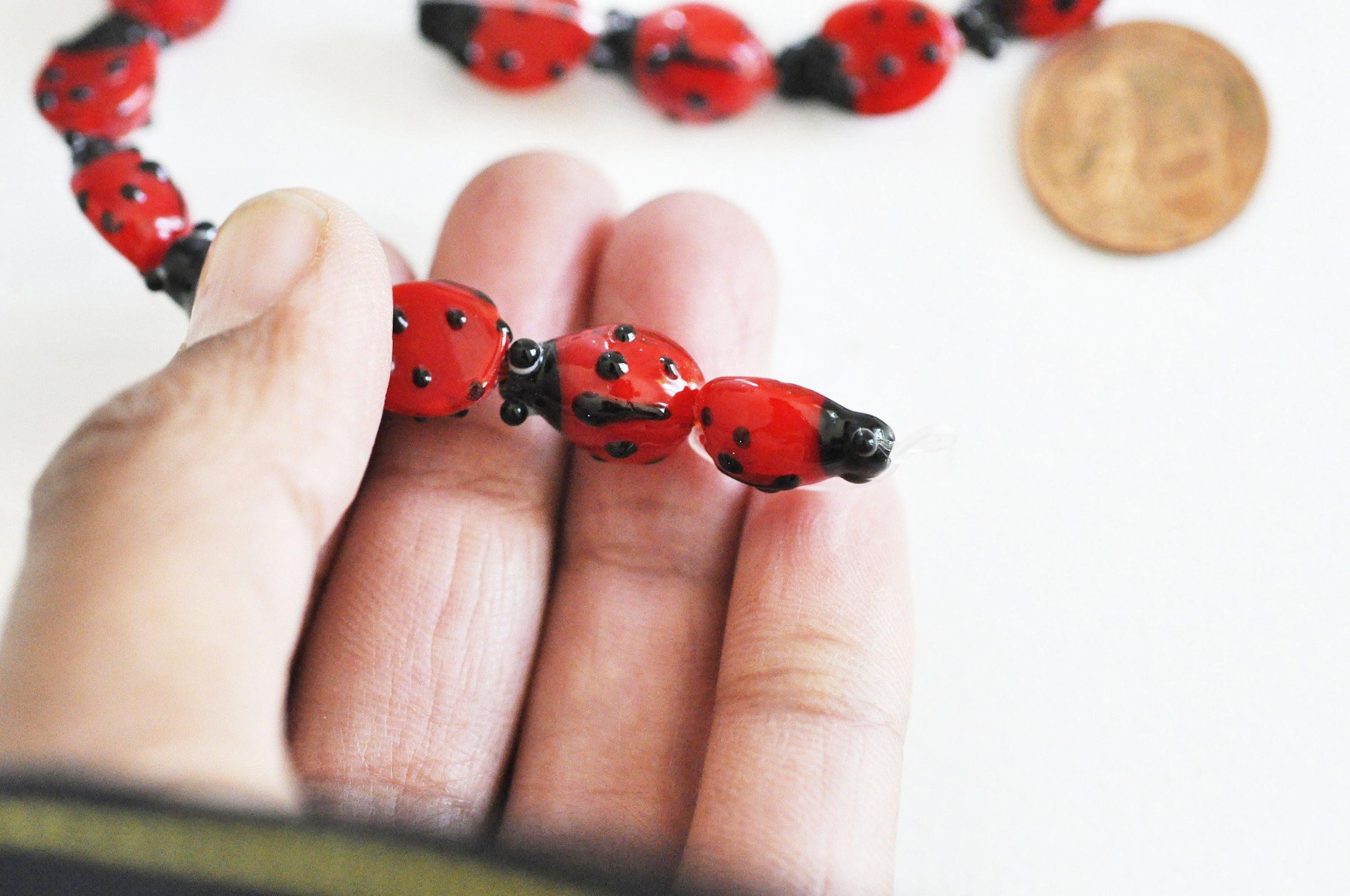 Un juego de cuentas de mariquita de vidrio rojas y rojas hechas a mano, para colgar en tus aros, collares y otros accesorios o joyas.