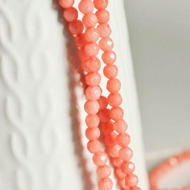 Cuentas de jade rosa coral, suministro creativo, cuentas de jade, piedra natural, jade natural, cuentas de piedra, cuentas facetadas, 4 mm, hilo de 91 cuentas Una tira de aproximadamente 91 cuentas de jade teñidas y facetadas. Diámetro 4 mm Agujero:...