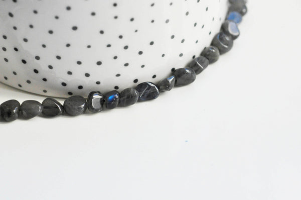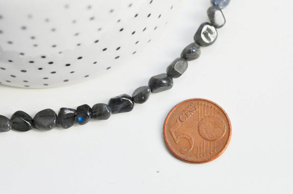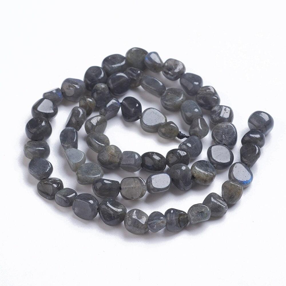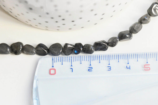 Un hilo de aproximadamente 40 pepitas de labradorita natural, para hacer joyas de piedra natural Longitud: 9-11 mm Ancho: 8-9 mm Espesor: 5-10 mm Agujero: 1 mm Otras cuentas de jade, ágata y piedras naturales están disponibles en la tienda...