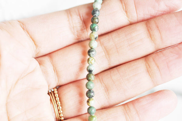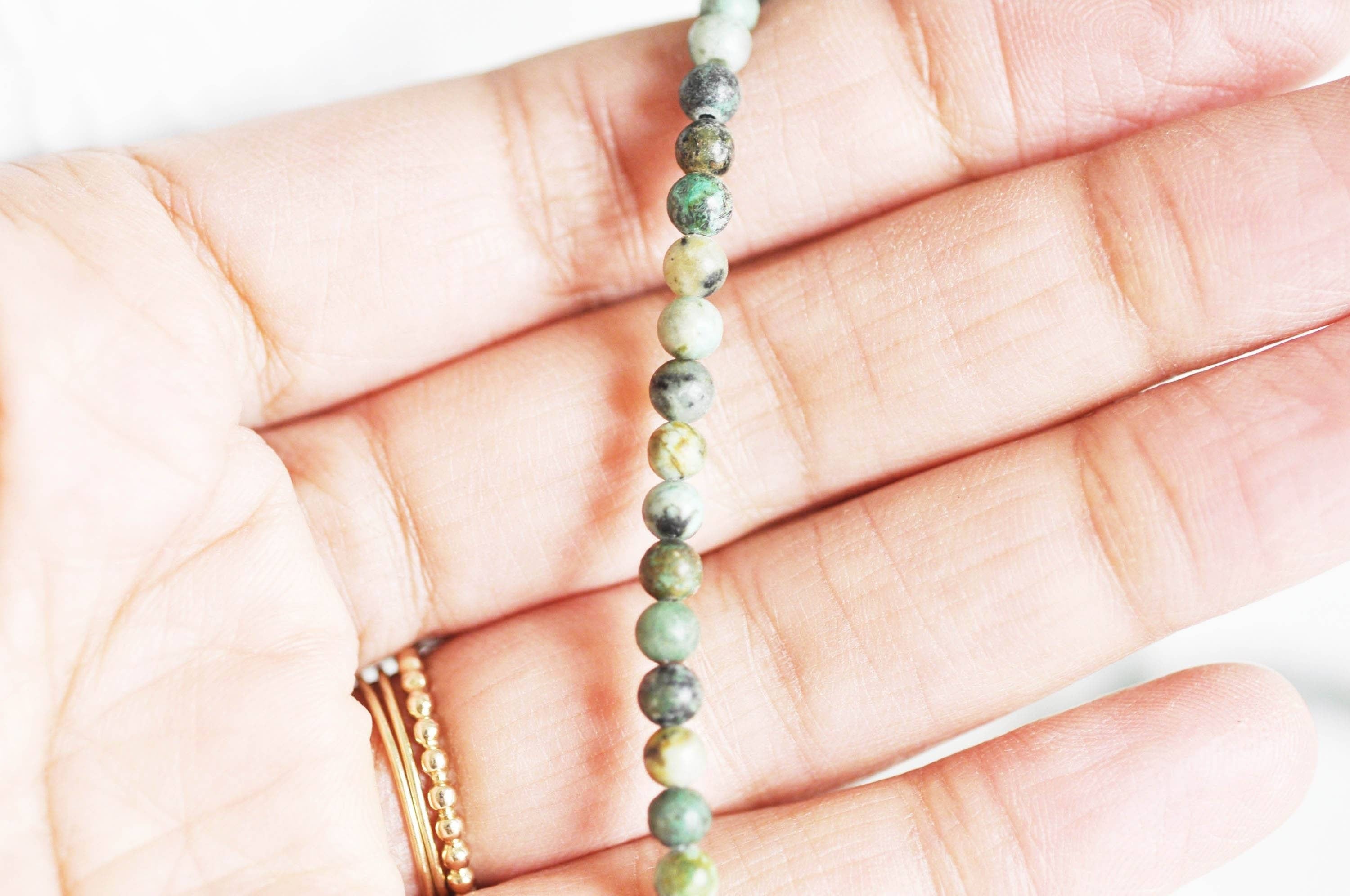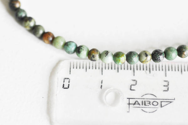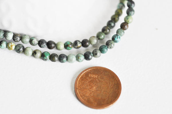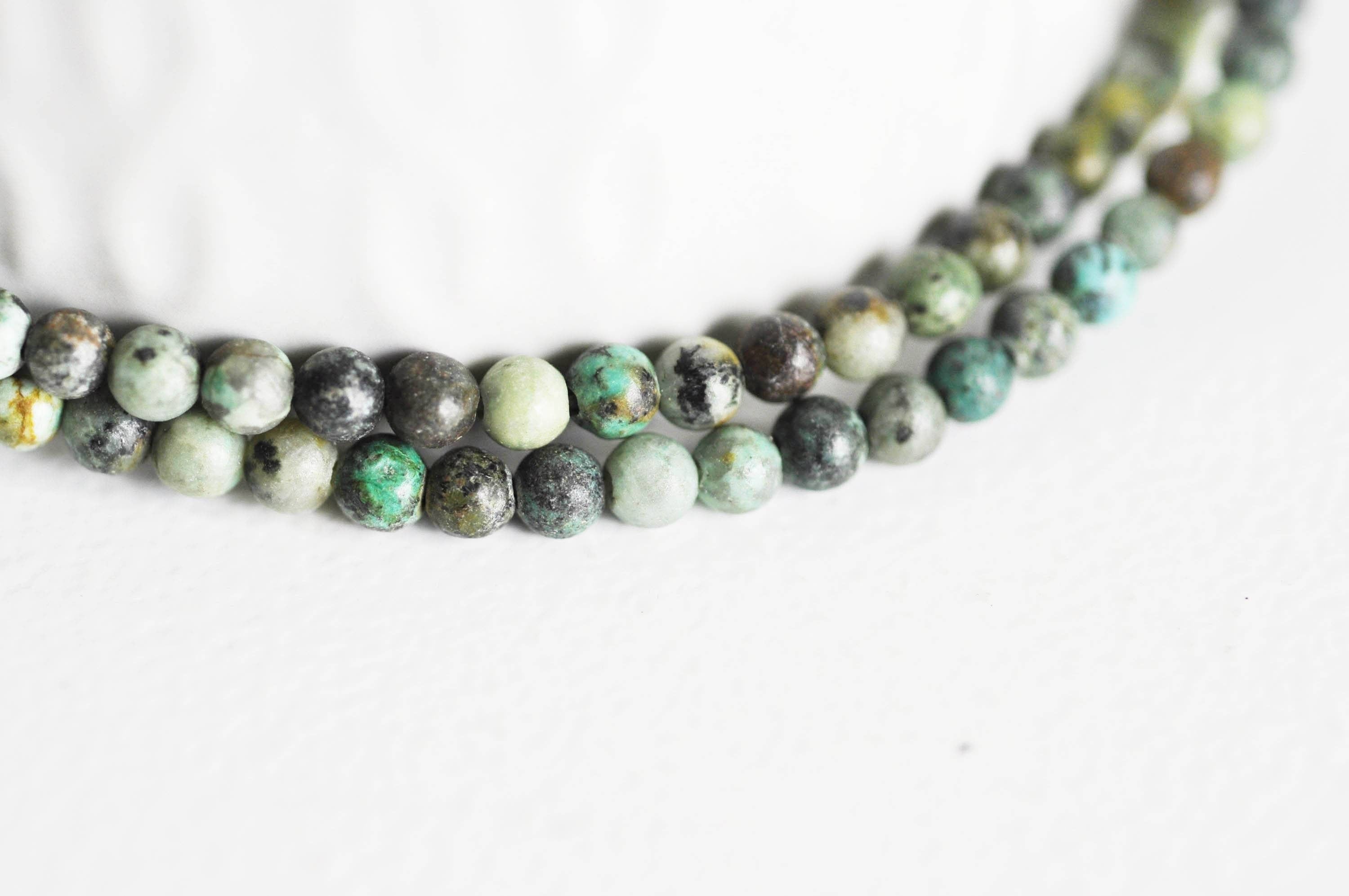 Dale un toque mineral y auténtico a tus creaciones con esta tira de cuentas redondas de turquesa africana natural de 4 mm . Cada cuenta revela una gama única de verdes, marrones y azules, para crear joyas con un aspecto natural y natural.