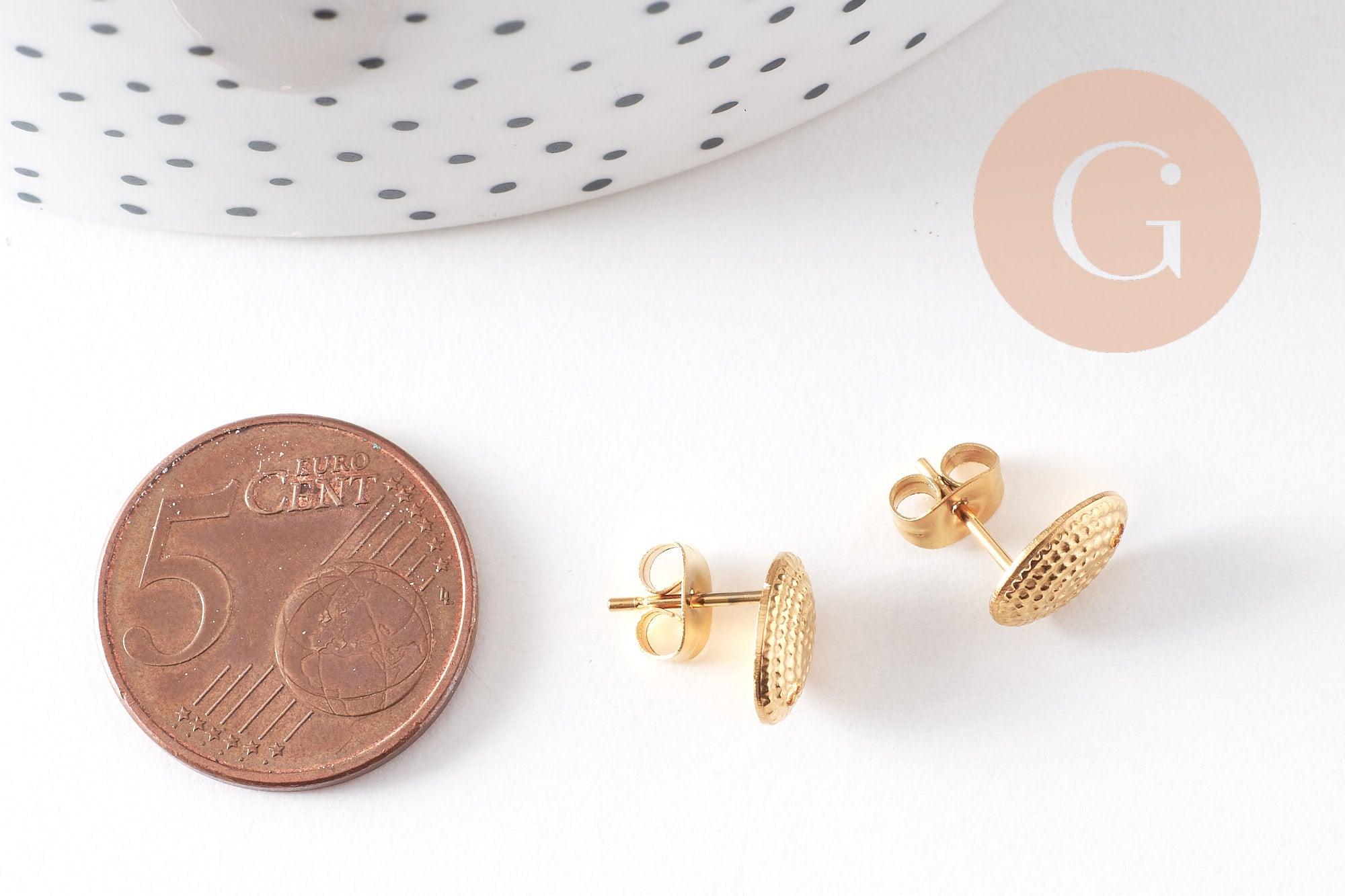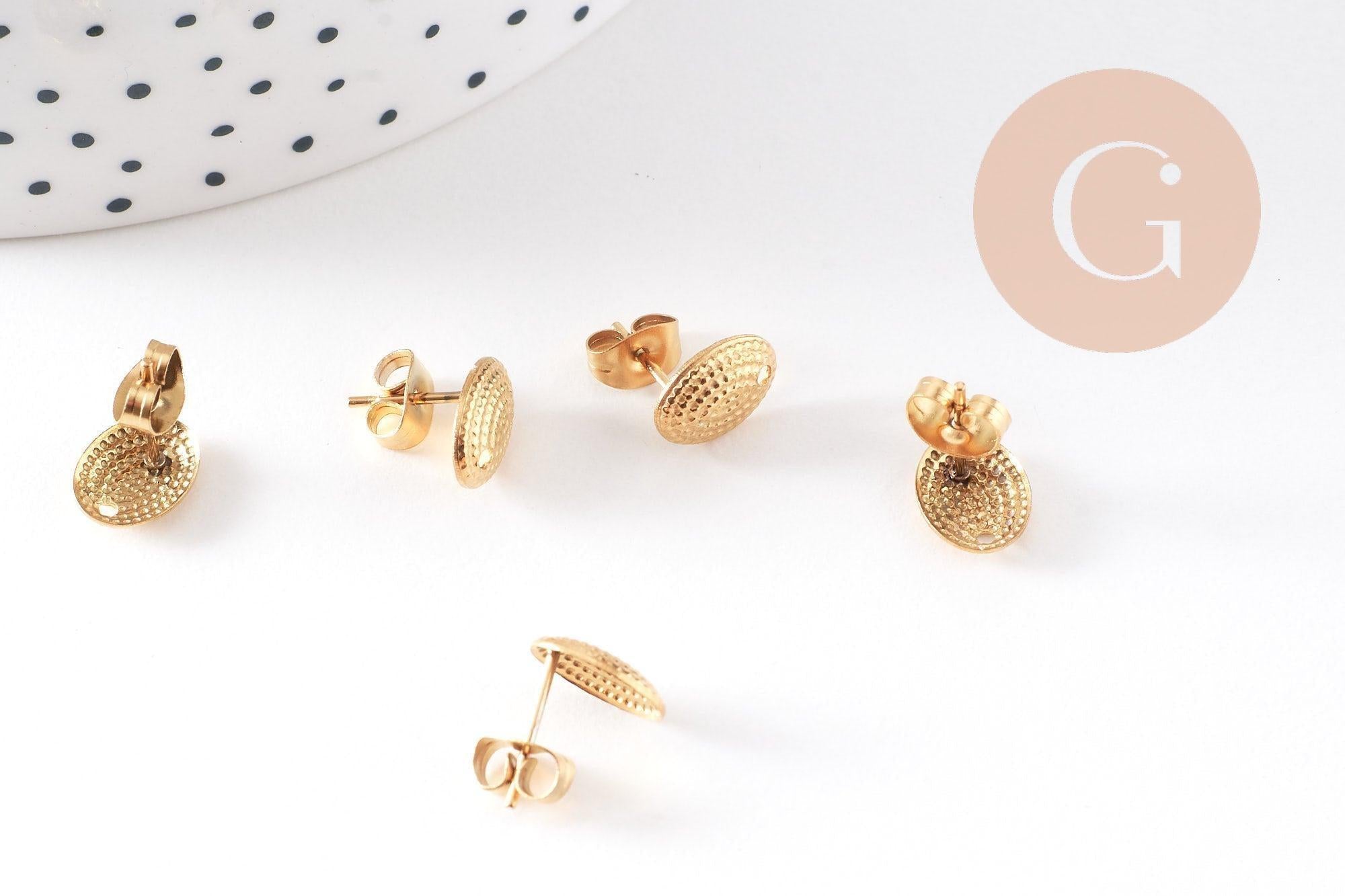 Estos aretes de acero inoxidable dorado ovalado texturizado son perfectos para crear aretes modernos y elegantes. Su superficie decorada con pequeños puntos en relieve les confiere un acabado sutilmente sofisticado, ideal para joyas a la vez refinadas y originales.