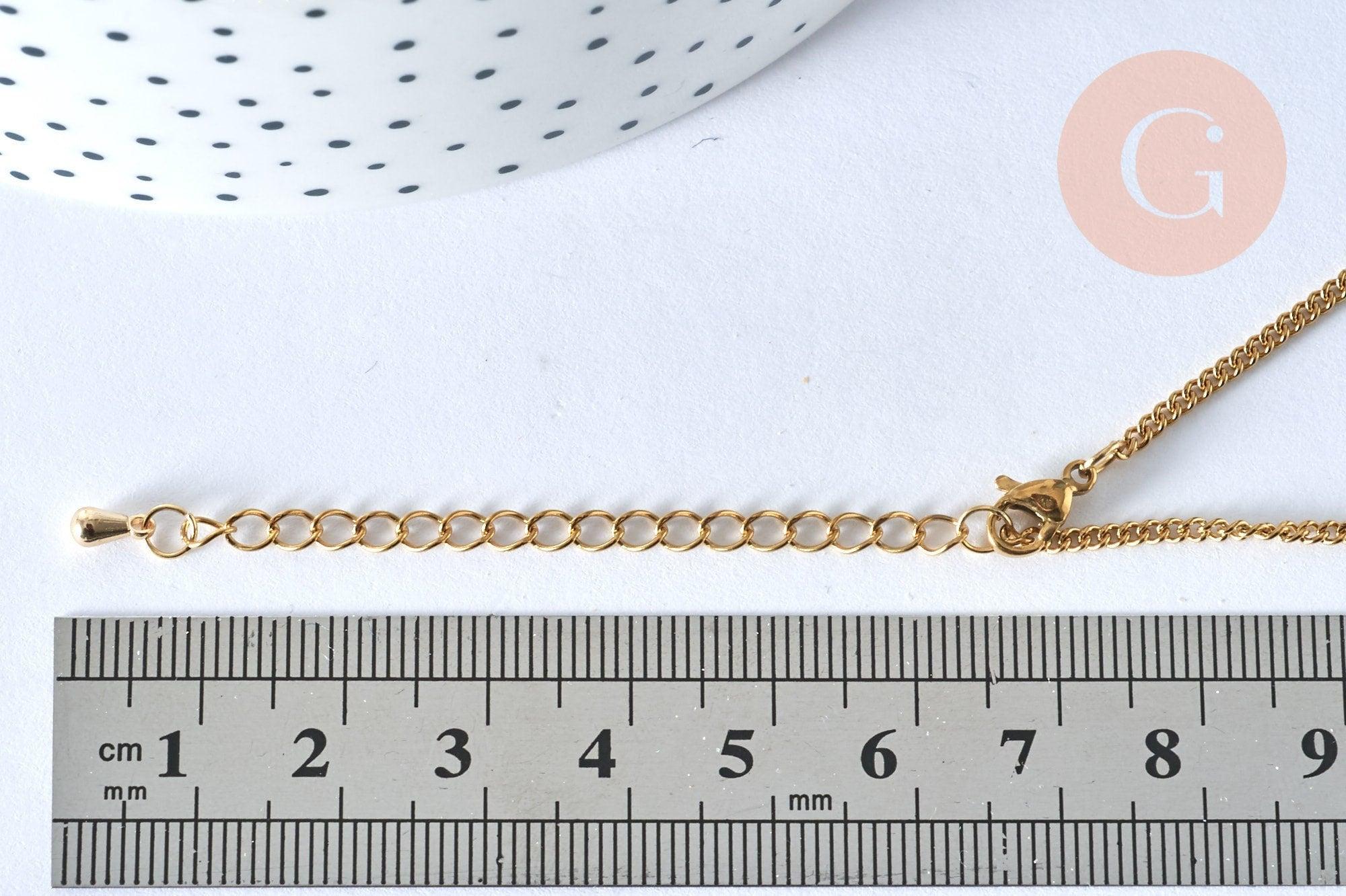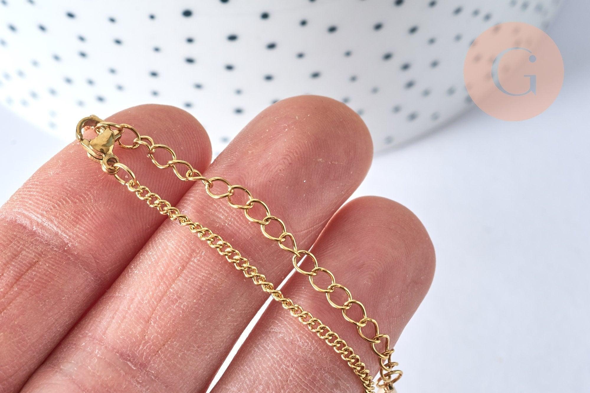 Esta base de pulsera de malla plana en acero chapado en oro de 14k es ajustable gracias a su extensión y su cadena personalizable con sus dos anillos al final de la cadena para personalizar mediante un colgante de conector.