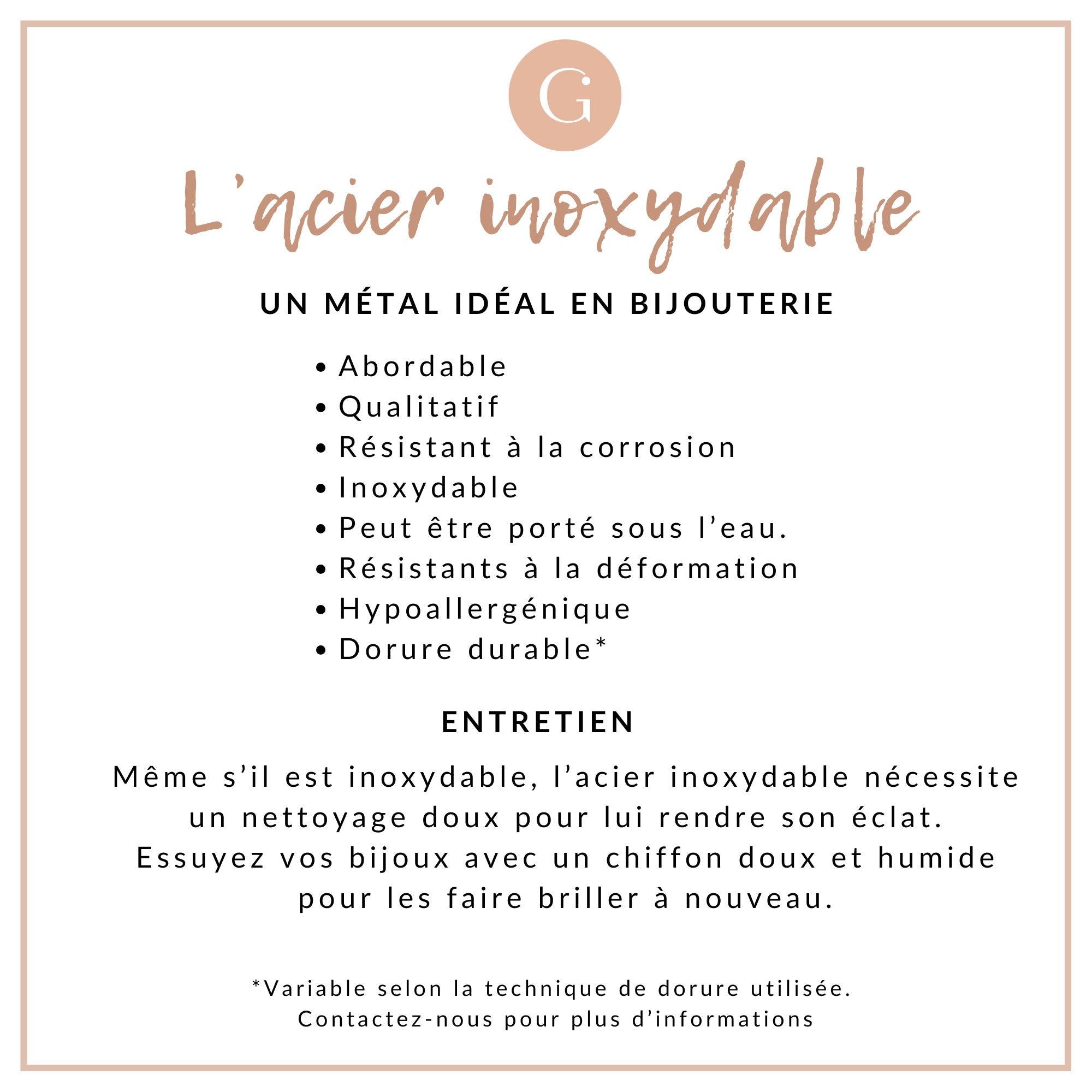 El acero inoxidable es un material muy popular por sus múltiples ventajas, es muy fuerte y robusto, completamente hipoalergénico, no se oxida ni se oxida. Su resistencia al agua y al sudor lo convierte en un metal ideal para la joyería cotidiana. No es necesario quitarse la cadena para hacer deporte, ducharse o nadar en agua de mar.