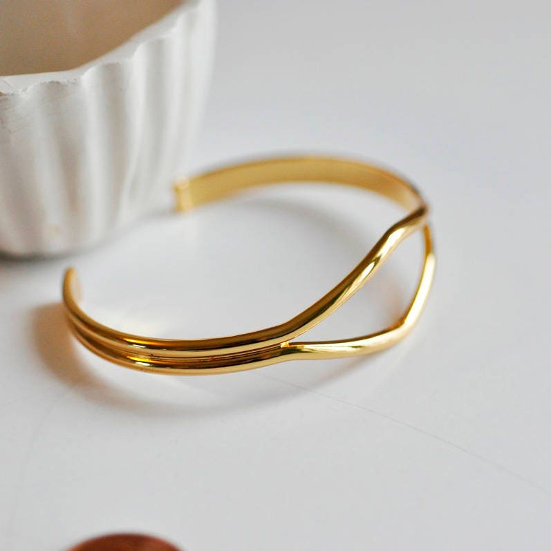 Añade un toque de elegancia atemporal a tus creaciones con esta pulsera tipo brazalete abierto ajustable , bañada en oro de 16 quilates .