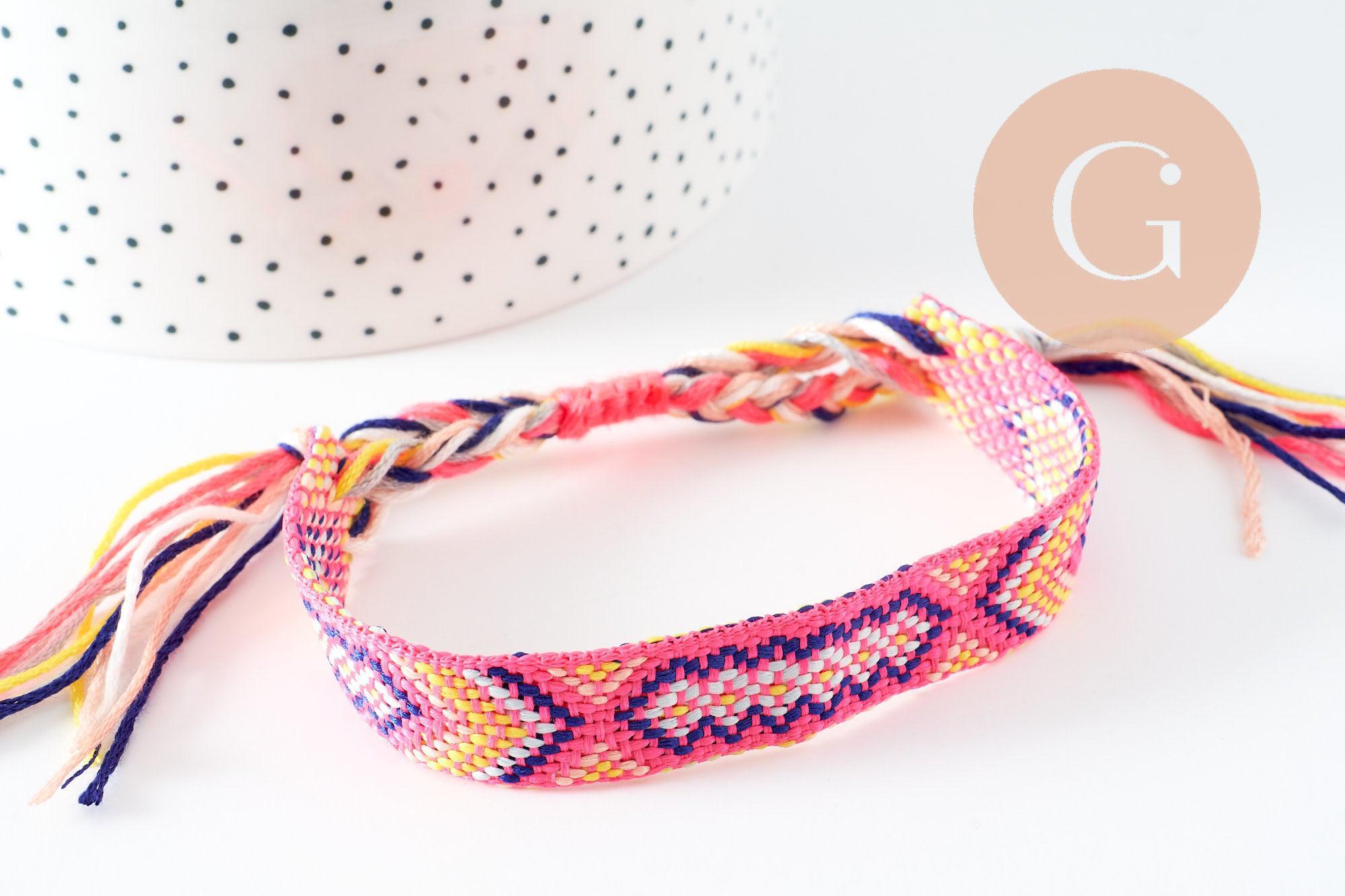 Aporte un toque de color y simbolismo con esta pulsera brasileña tejida en vibrantes tonos de rosa y amarillo .