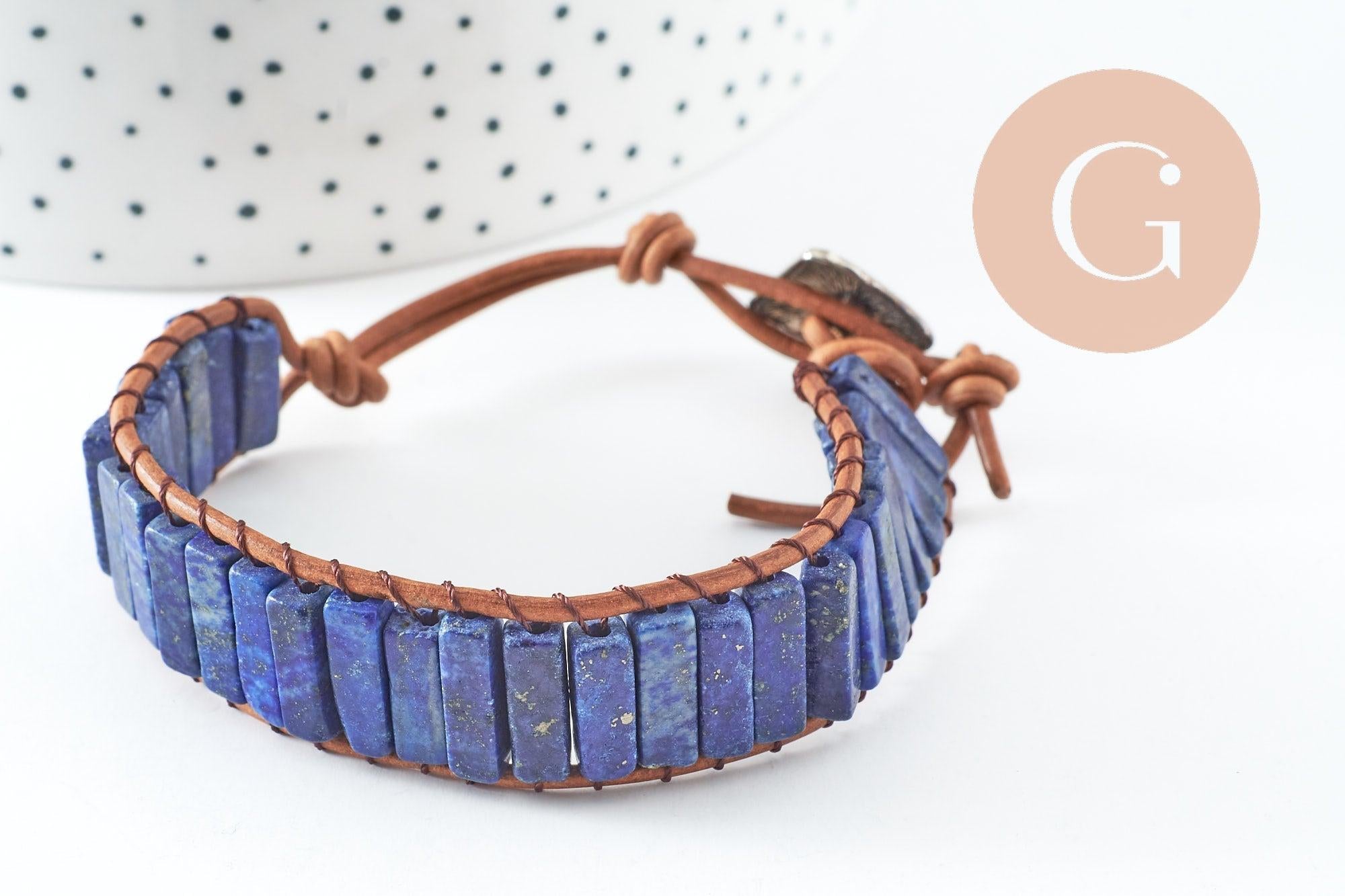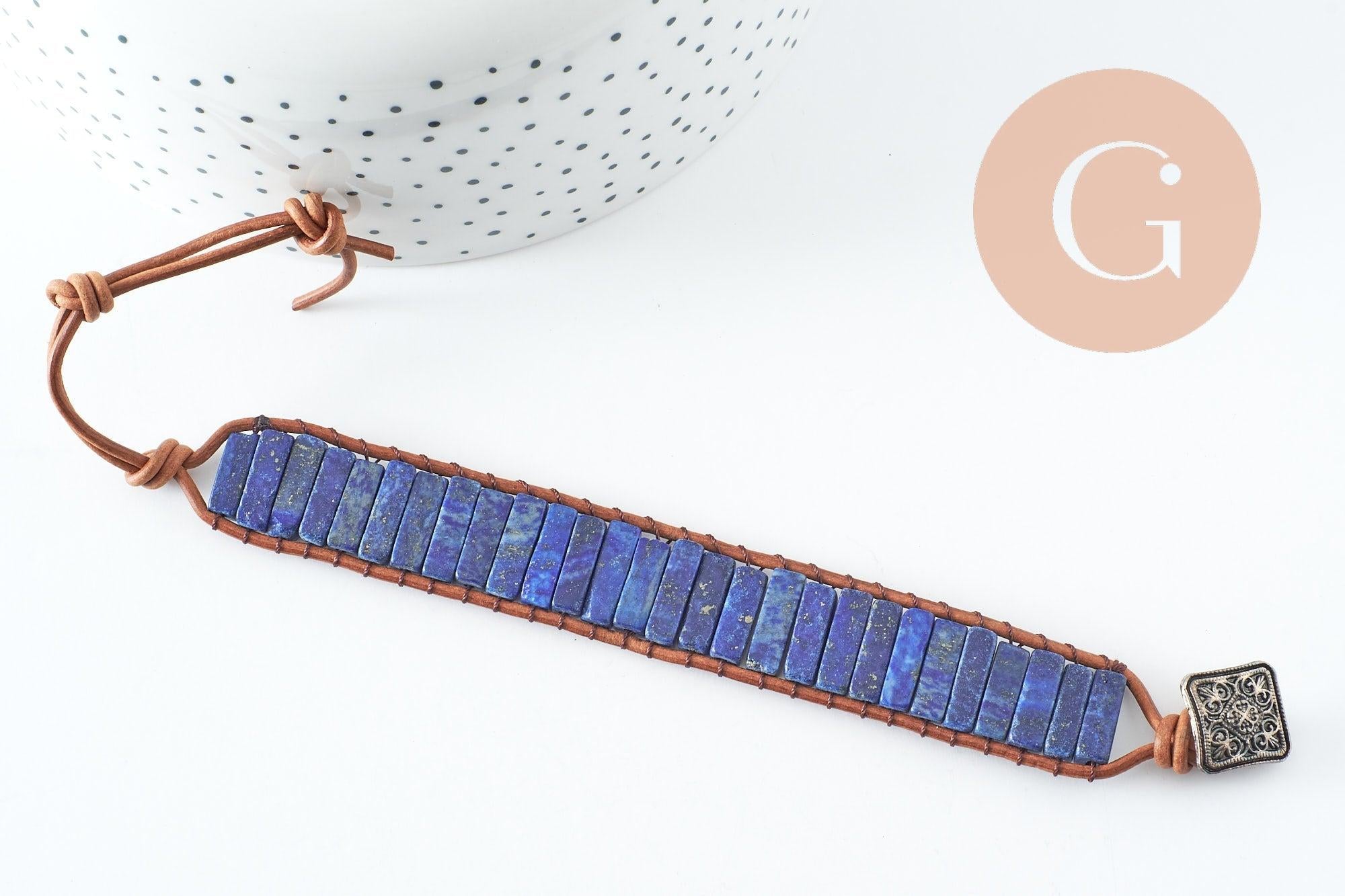 Aporta un toque elegante y espiritual a tus complementos con esta pulsera ajustable en lapislázuli natural y piel . Con unas medidas de entre 23 y 28 cm gracias a su sistema ajustable, esta joya se adapta a todos los tamaños de muñeca.
