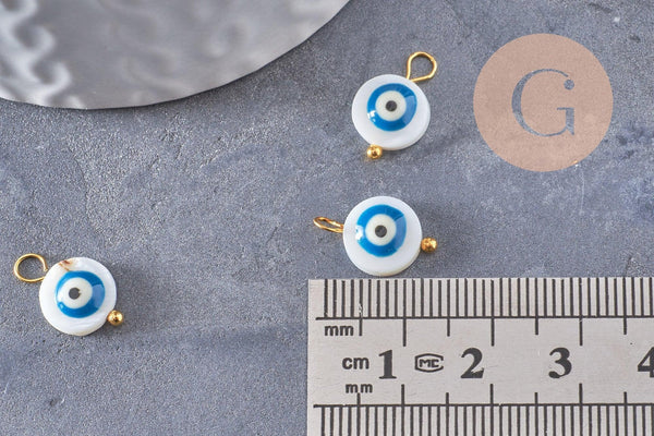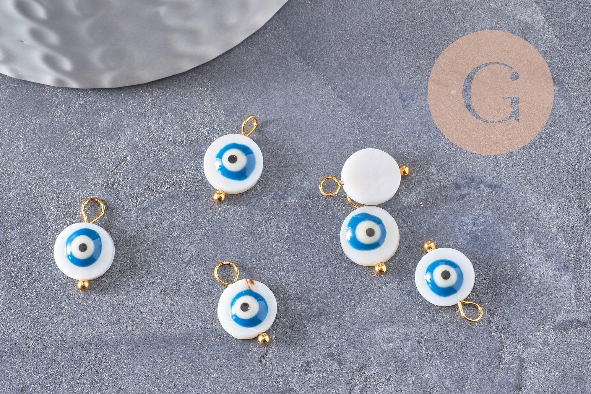 Amuleto redondo de ojo turco de nácar natural blanco, zamac chapado en oro, 14 mm, x2 (G9922)