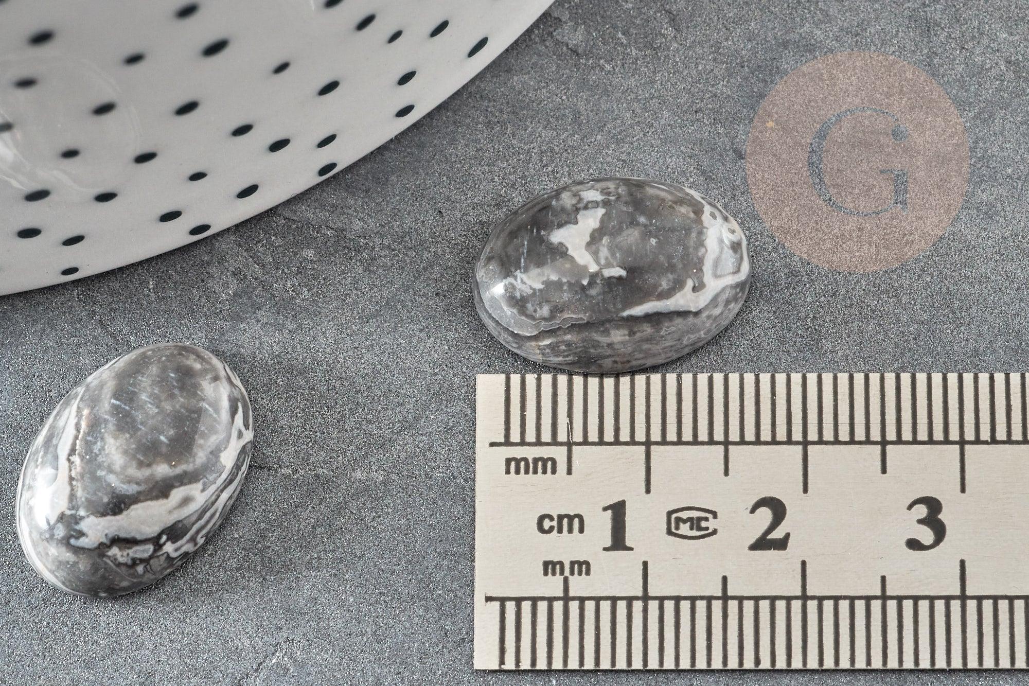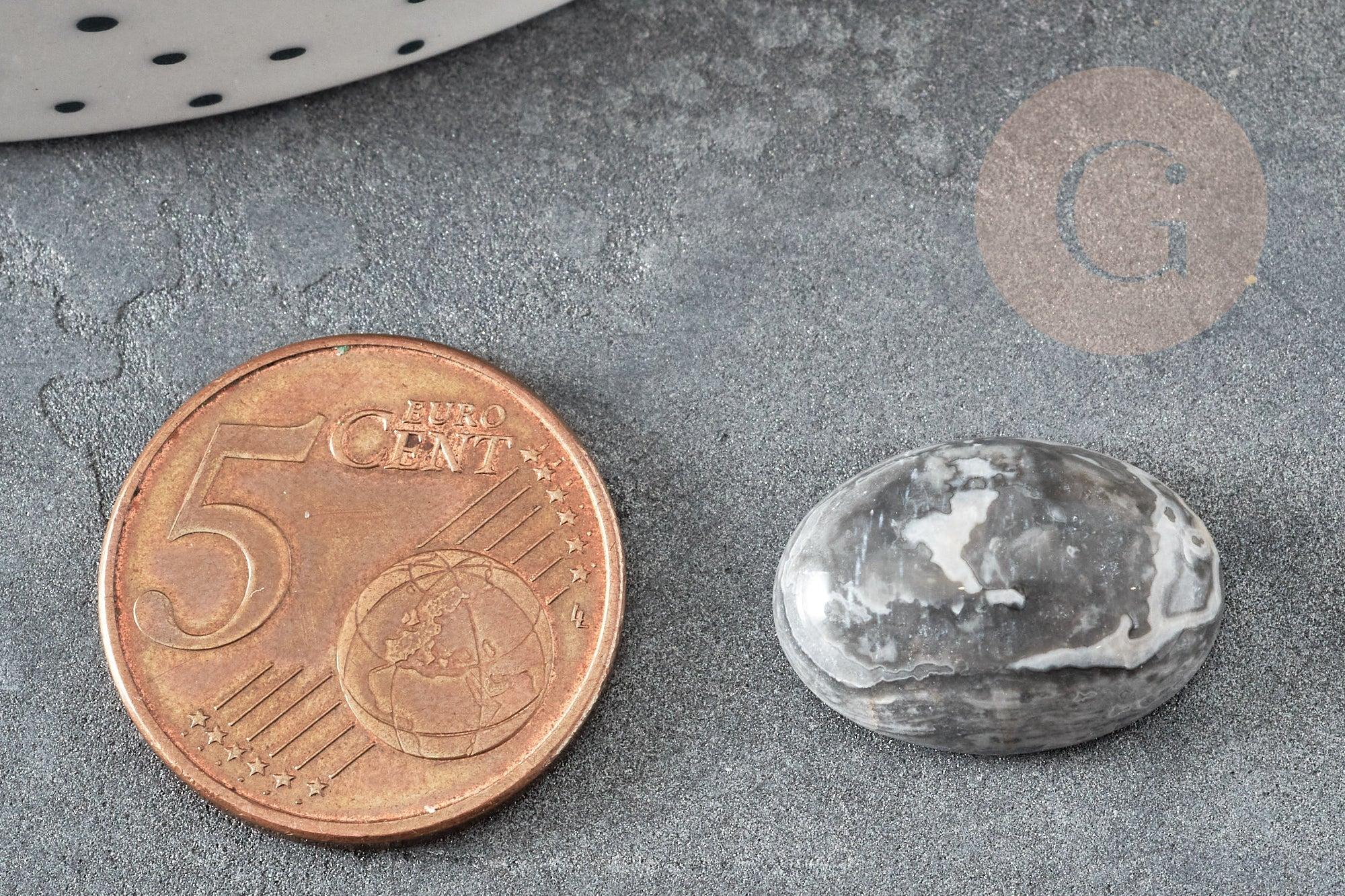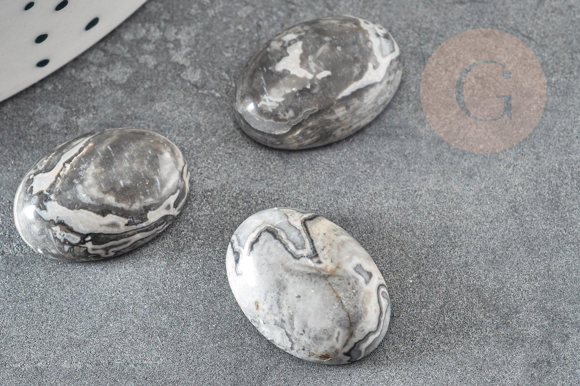 Este cabujón de jaspe cebra natural , de forma ovalada (13x18 mm) , se distingue por sus patrones únicos en blanco y negro, que recuerdan el pelaje de la cebra.
