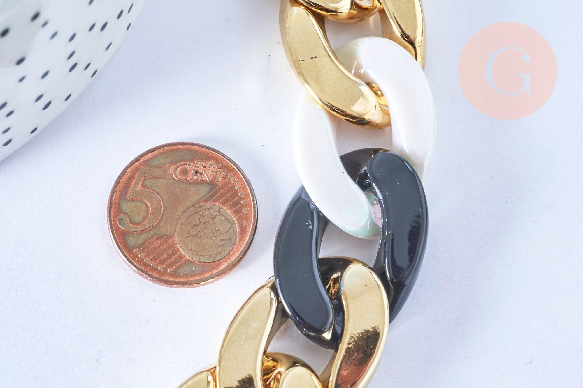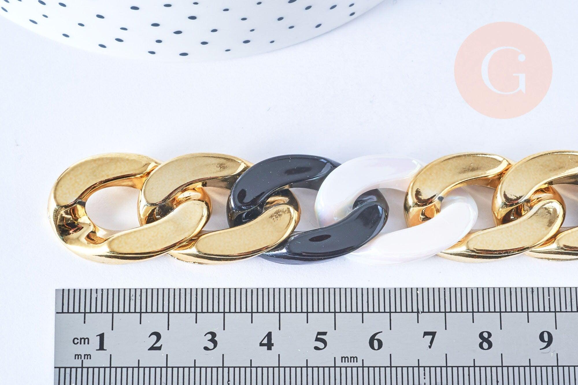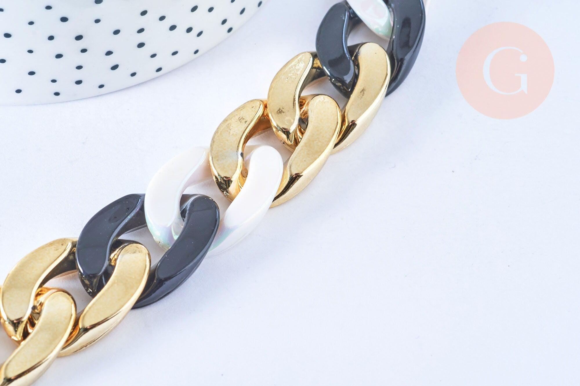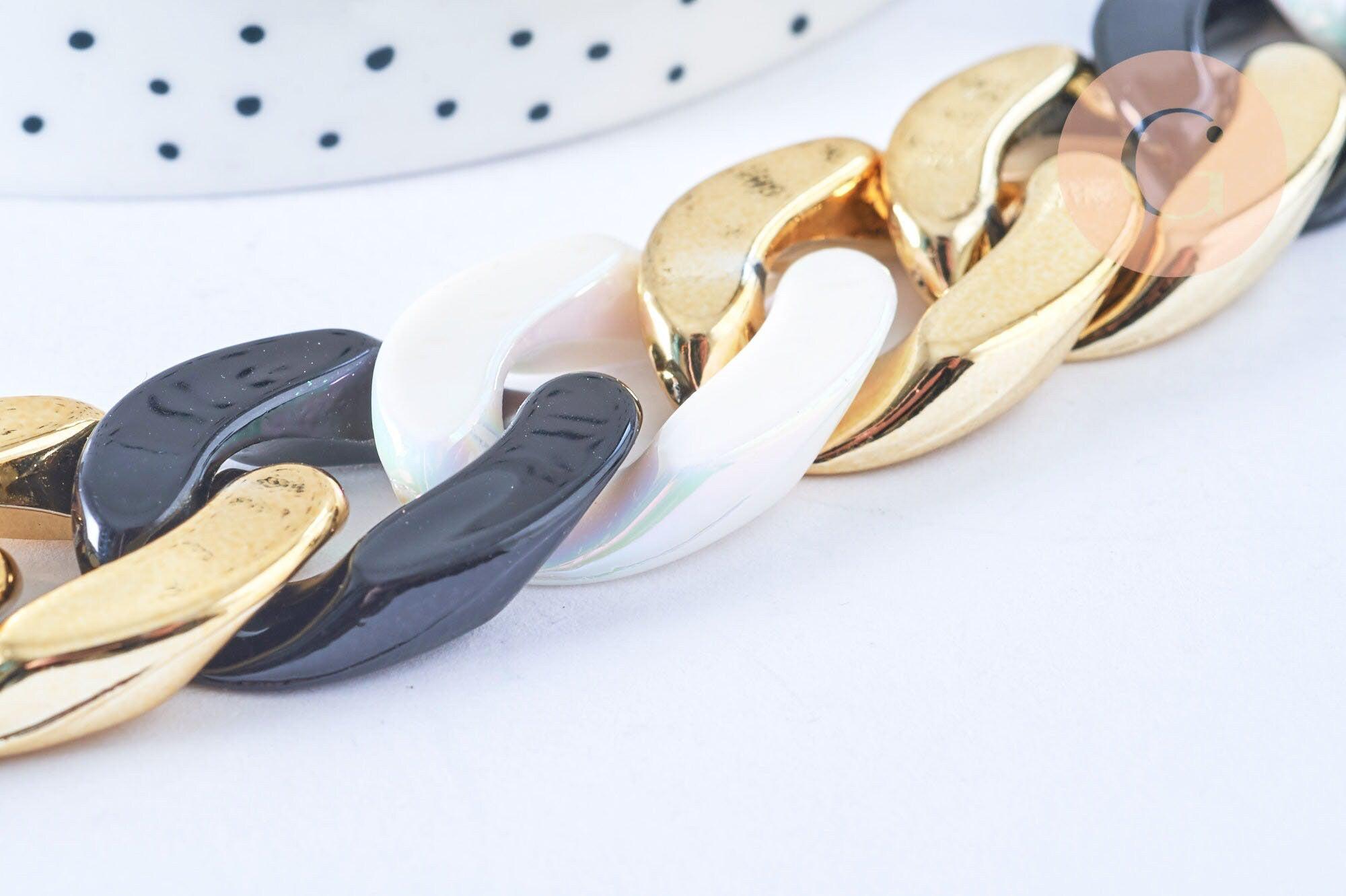 Luce un estilo único con esta gruesa cadena de acrílico blanco y negro, adornada con eslabones de aluminio dorado. Ideal para crear joyas modernas, gráficas y llamativas , esta cadena se convertirá rápidamente en la pieza central de tus collares, pulseras o pendientes llamativos.