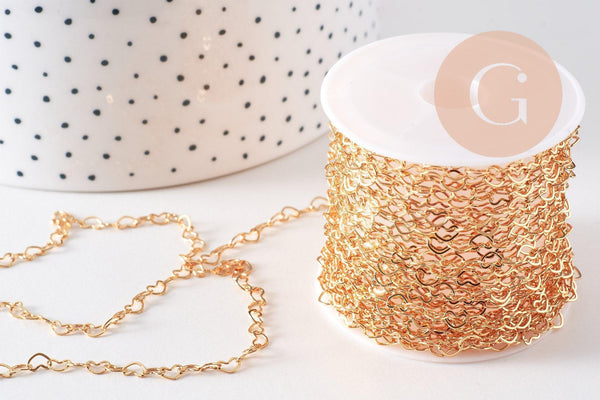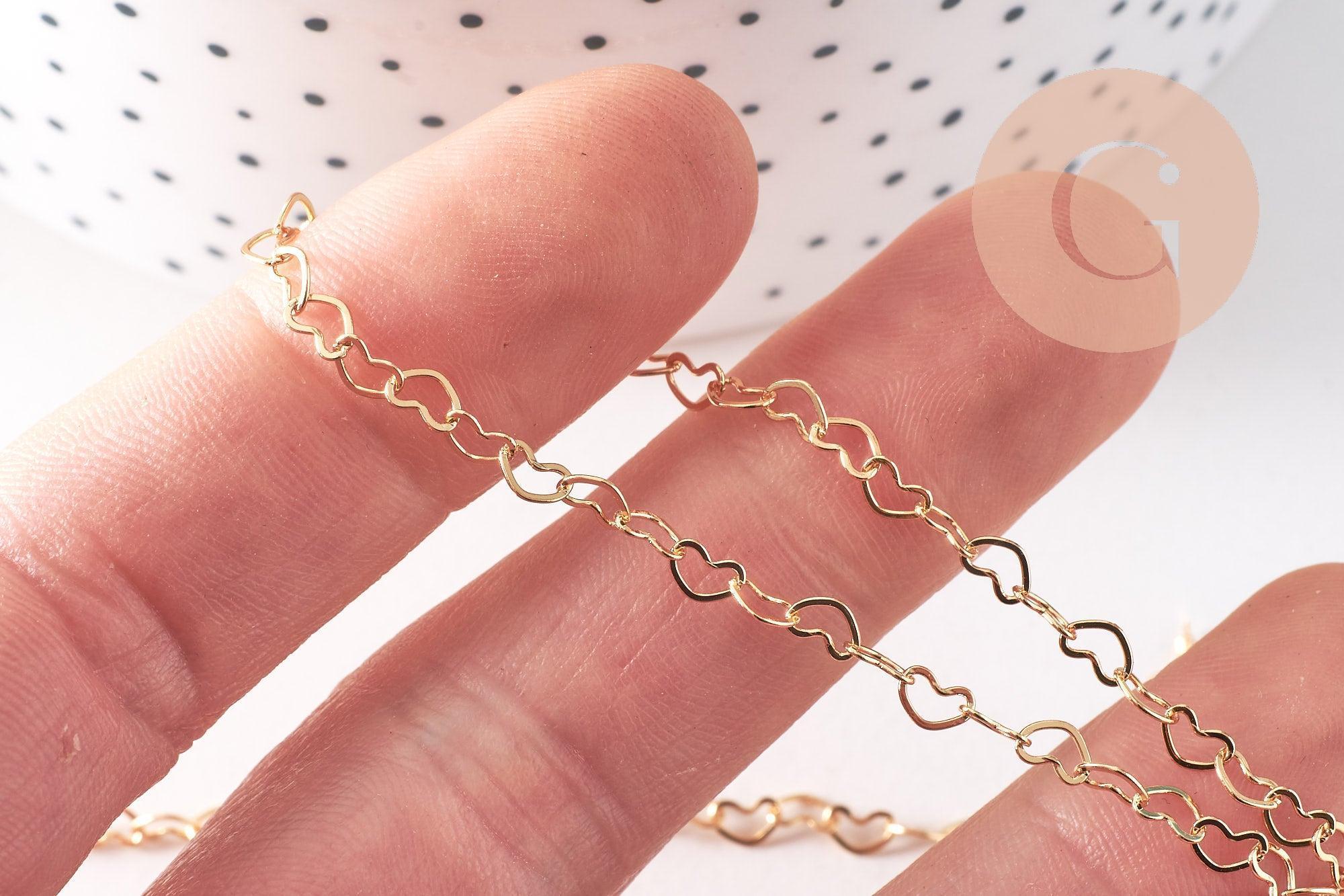 Cadena de corazón de latón bañada en oro , ideal para crear rápidamente tus propias joyas. Esta delicada cadena, con su cierre incluido, te permite crear fácilmente collares modernos. Combínala con cierres marinos grandes y medallas doradas para un estilo aún más marcado.