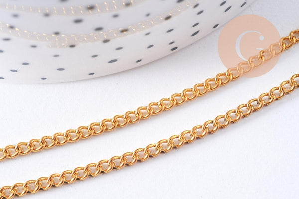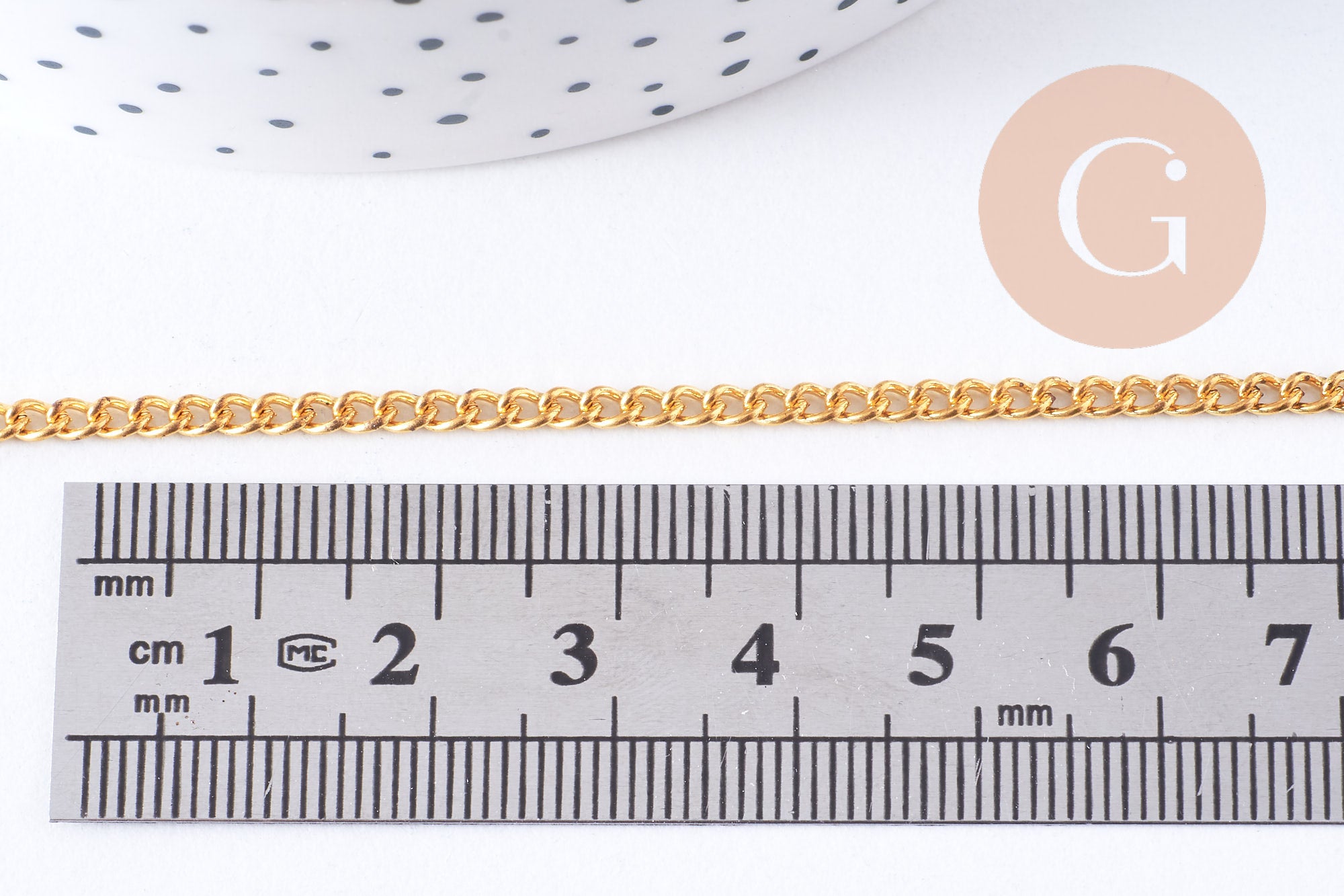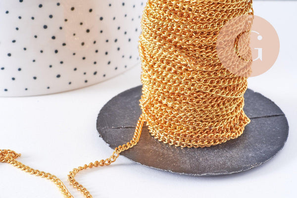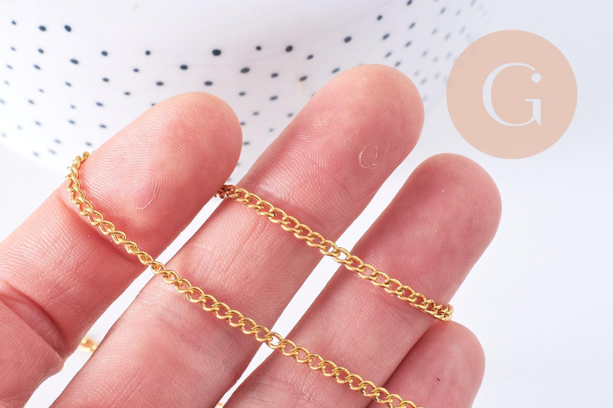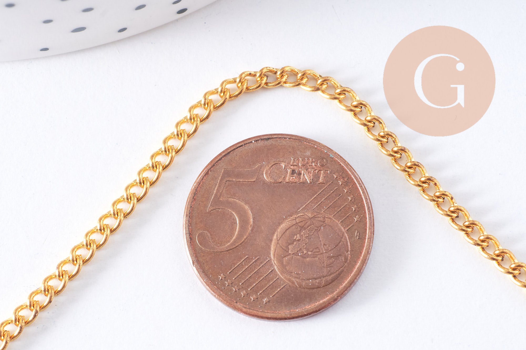 Dale un toque de brillo a tus creaciones con esta fina y luminosa cadena plana de hierro dorado . Ideal para todos tus proyectos de bisutería: collares, pulseras, pendientes o collares largos, se adapta a todas tus necesidades creativas.