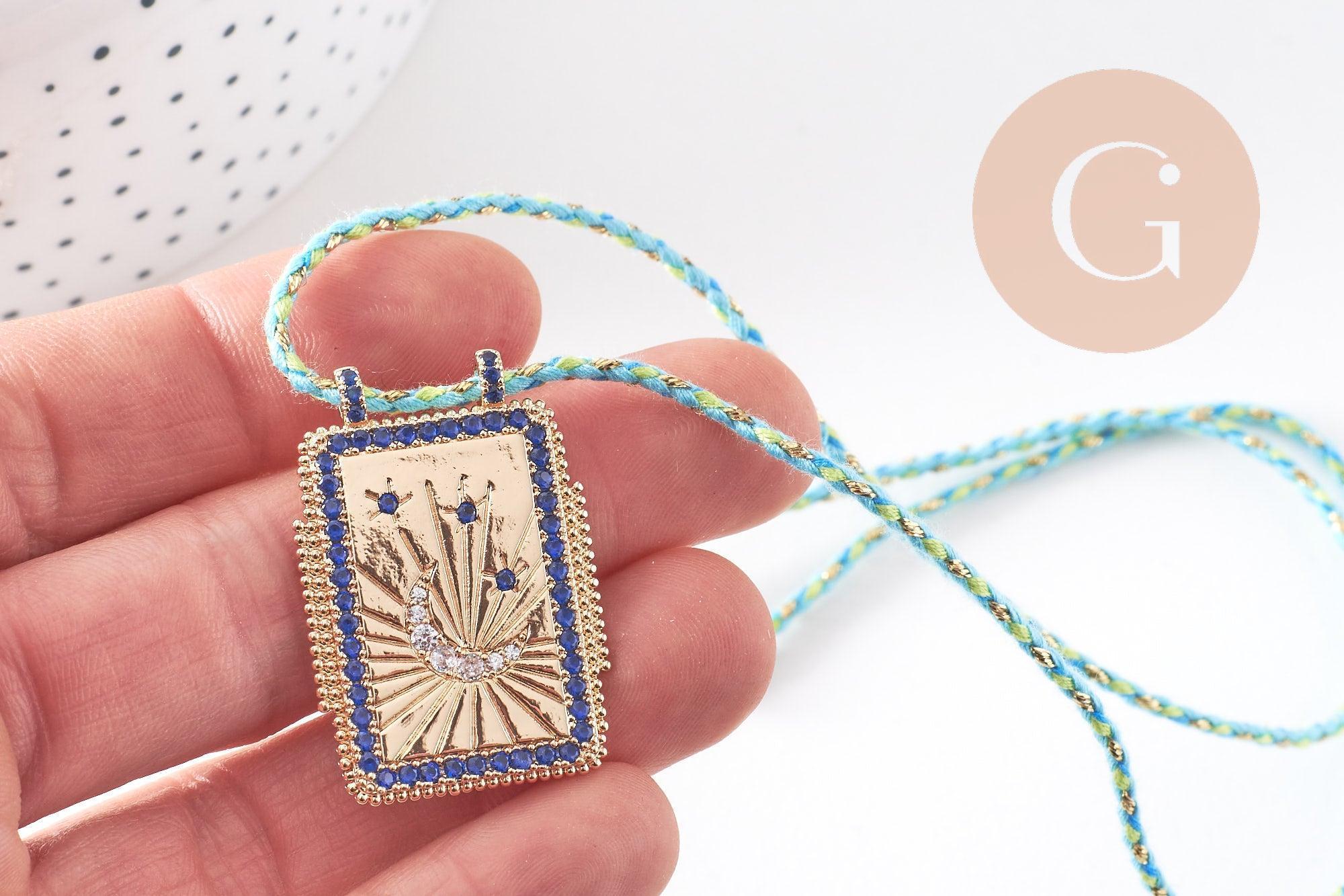 Collar con medalla de esmalte lunar y circonitas azules, cordón trenzado de zamac bañado en oro, 45 cm x1 (G10364-7)