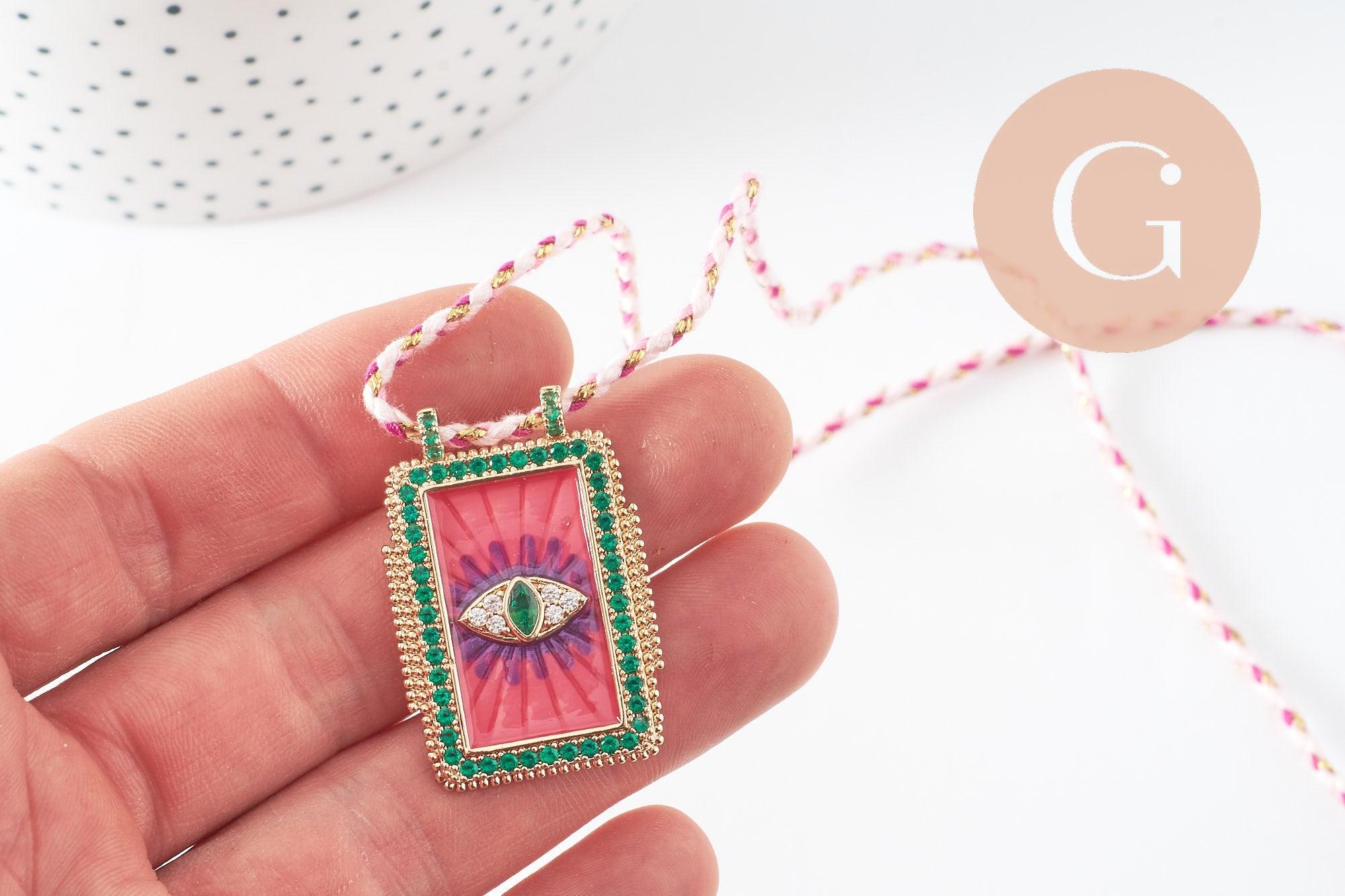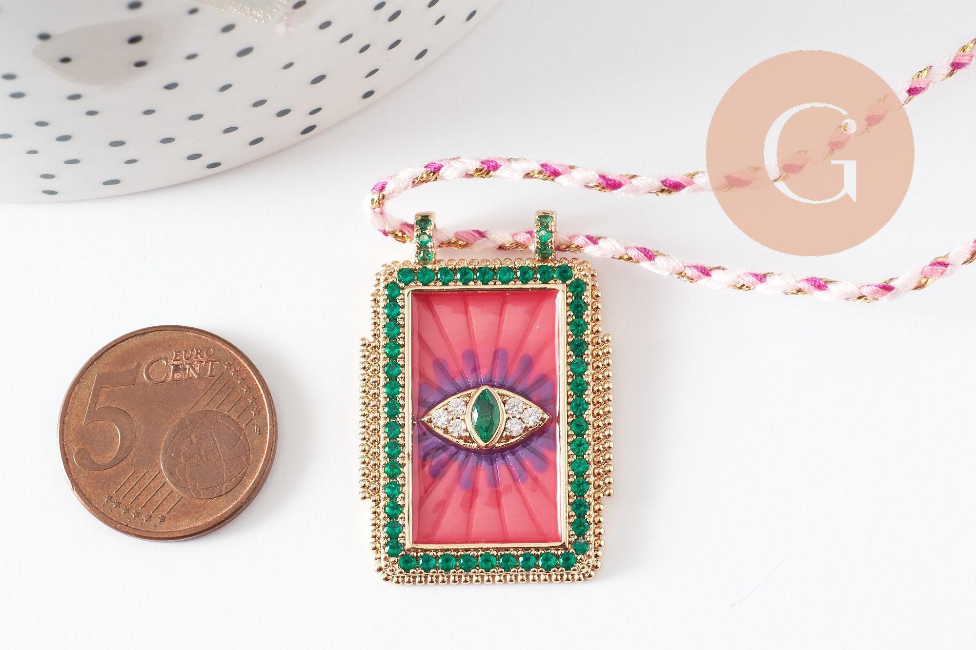 Collar medallón esmaltado Ojo circonita oro verde rosa zamac, cordón trenzado collar 45cm x1 (G9569)