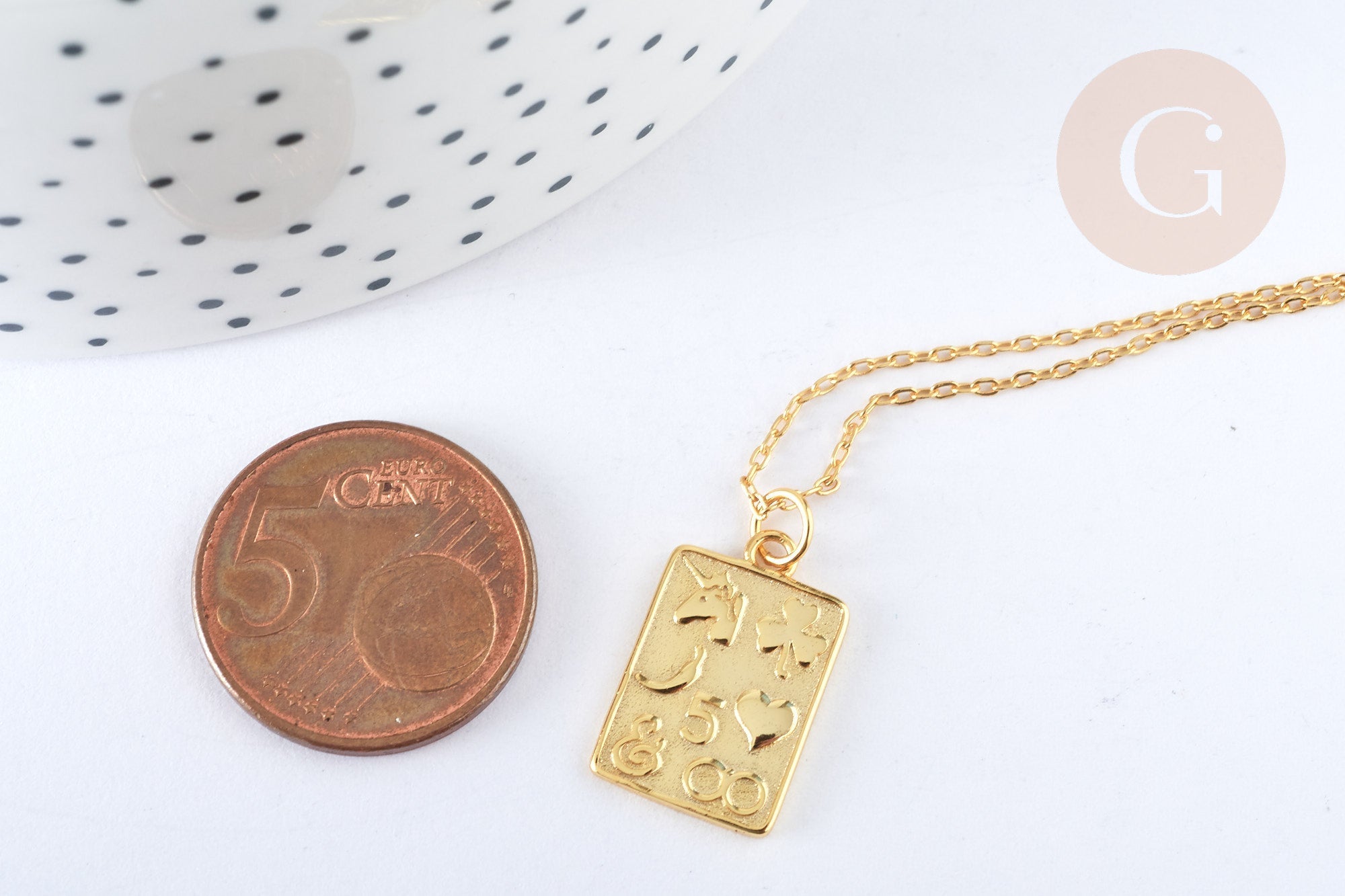Un collar de cadena tipo cable en plata maciza 925 cubierta con una fina capa de oro de 24 quilates, que presenta una delicada medalla rectangular decorada con símbolos de la suerte. Un bonito regalo para darte (a ti mismo).