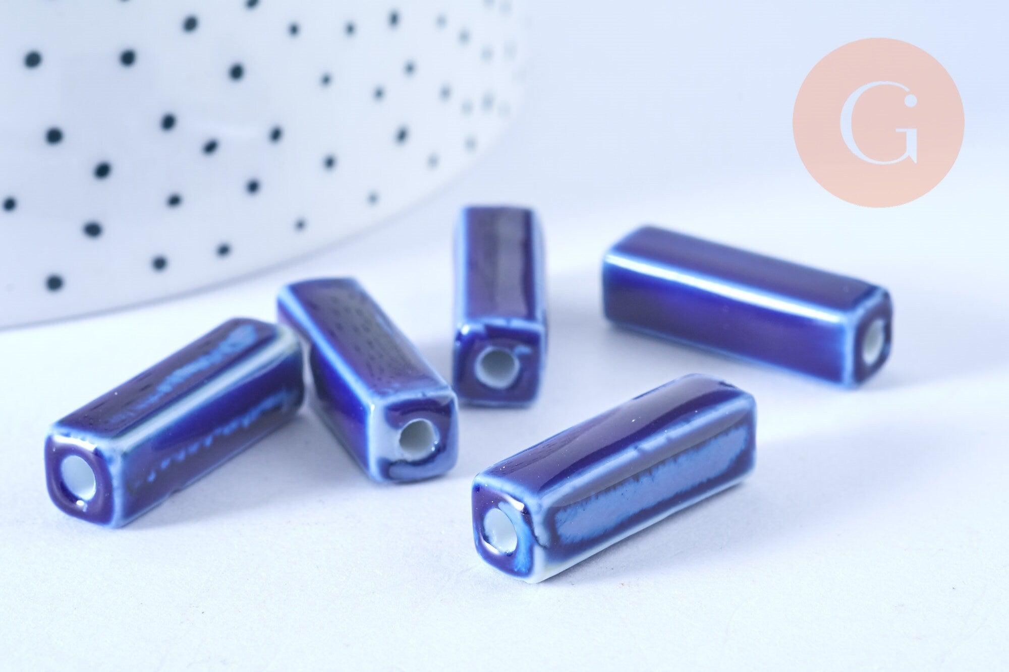 Un juego de 5 cuentas rectangulares de porcelana esmaltada en azul. Son unas preciosas cuentas hechas a mano. Longitud: 25-29 mm Ancho: 7-10 mm Diámetro: 6 mm Agujero: 2,5-3 mm Están disponibles otras cuentas de porcelana y cerámica. Sugerencia de...