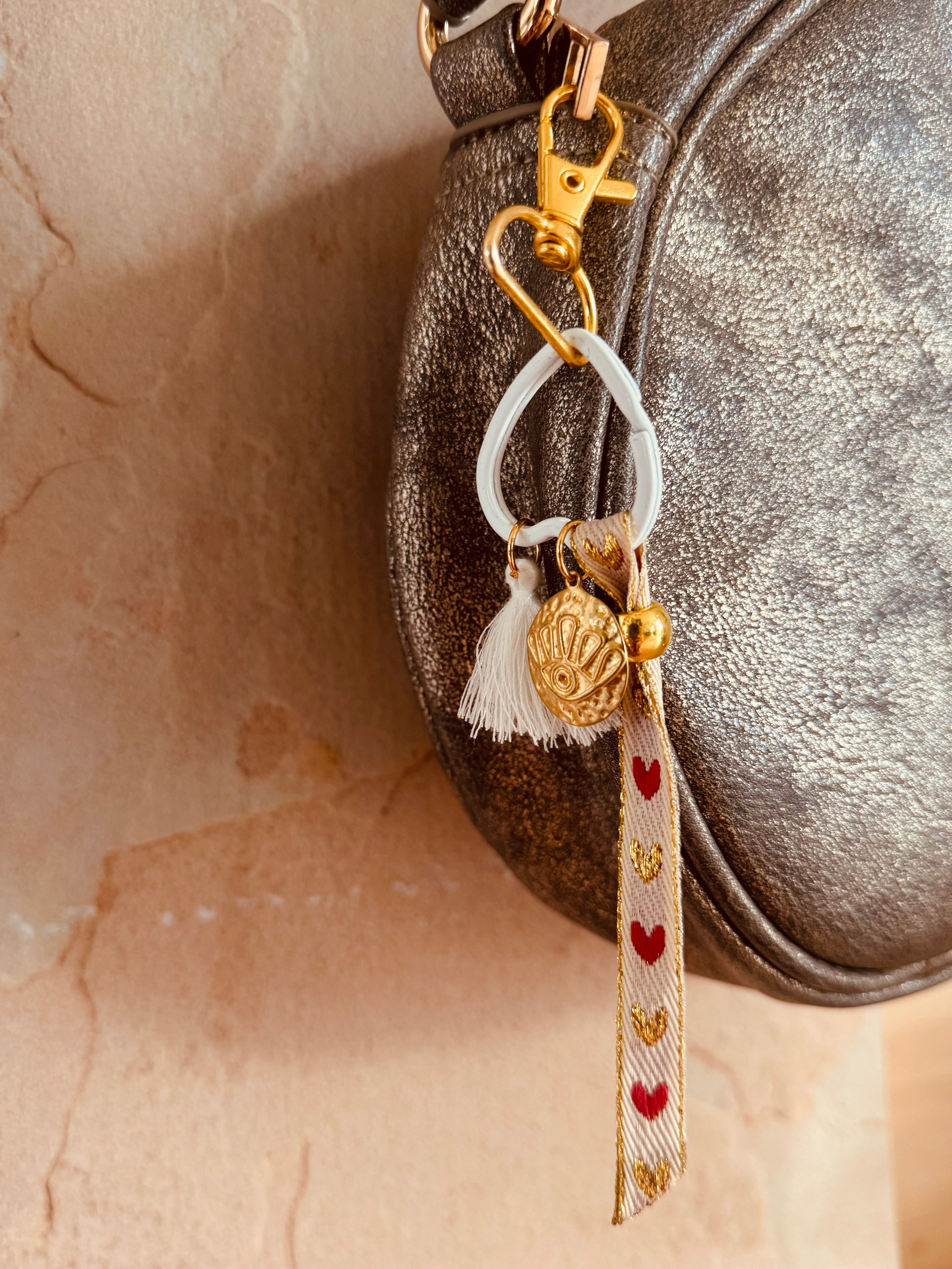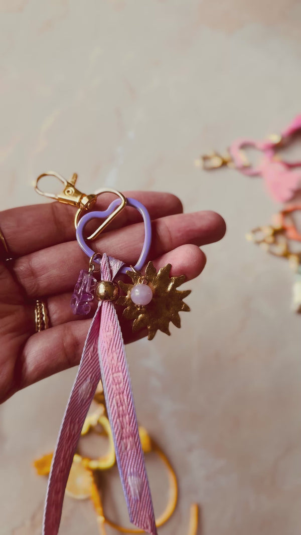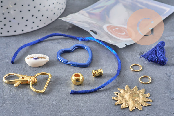 ¡Crea un amuleto de la suerte colorido y único con este kit completo! Contiene todo lo necesario para crear un hermoso amuleto que podrás colgar en tu bolso, estuche o llavero: llavero de corazón de colores, mosquetón dorado, cintas bordadas o de terciopelo, cordones, cuentas, colgantes y dijes.