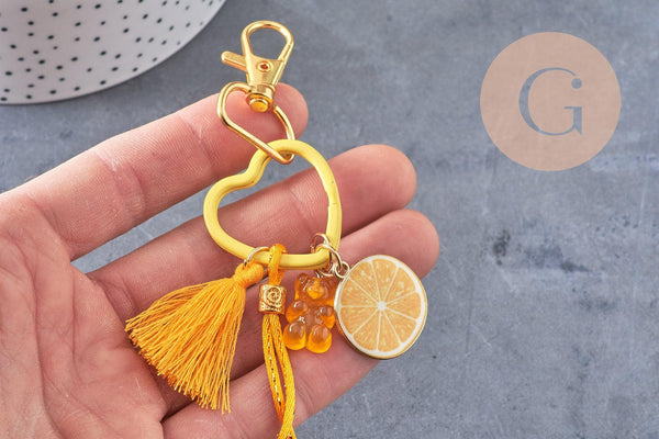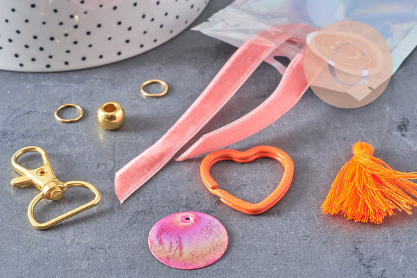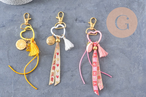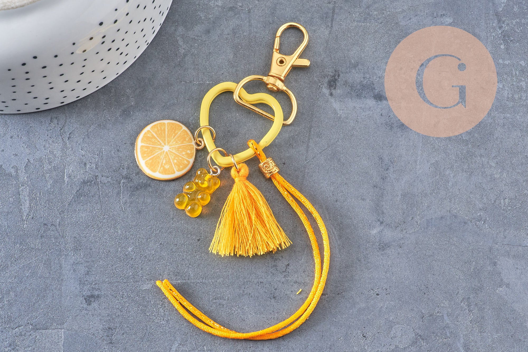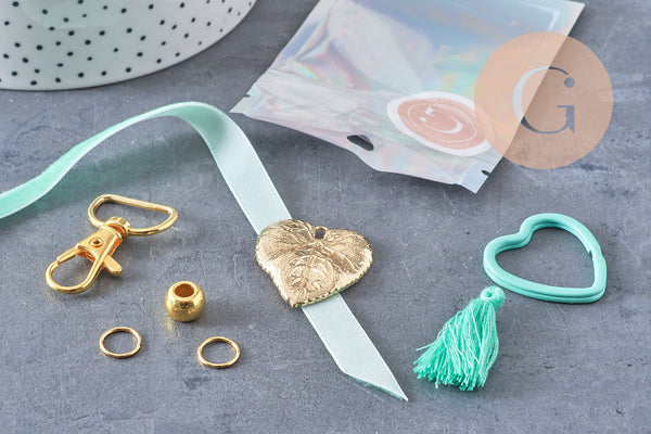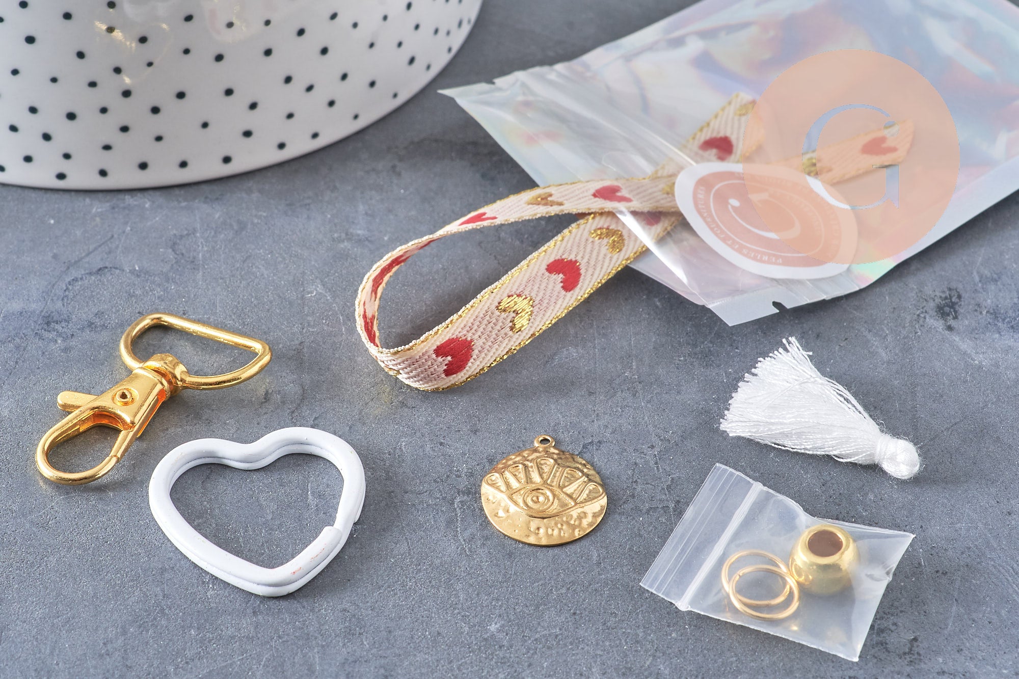 • Contenido: 1 llavero de corazón de color, 1 mosquetón dorado, cintas, cordones, cuentas espaciadoras, dijes y colgantes, anillos de acero inoxidable
