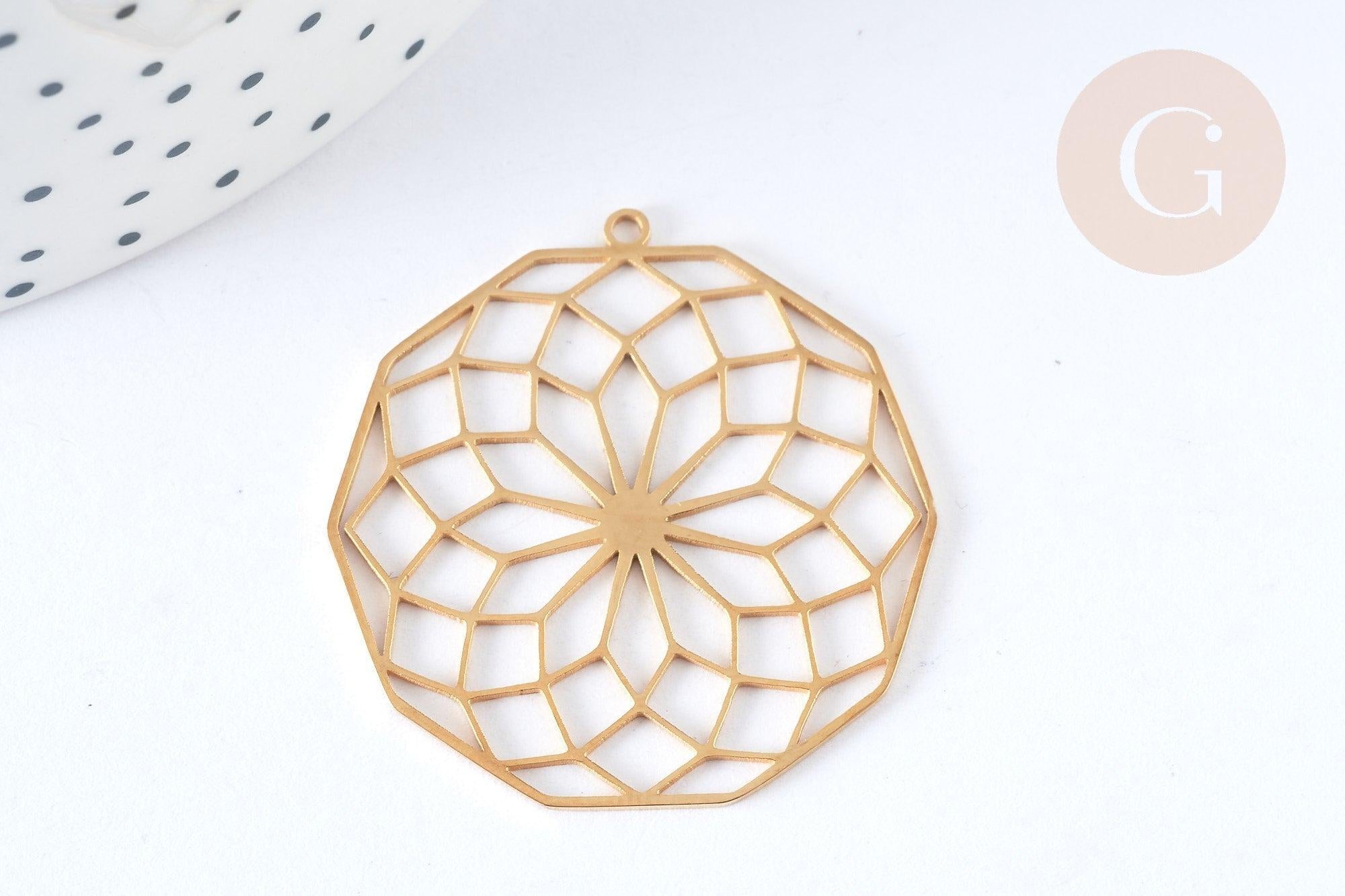 Déjate seducir por este colgante de acero inoxidable 201 bañado en oro, que representa una delicada flor de forma poligonal . Su estilo calado y geométrico lo hace ideal para creaciones bohemias o modernas, según la combinación de colores y materiales.