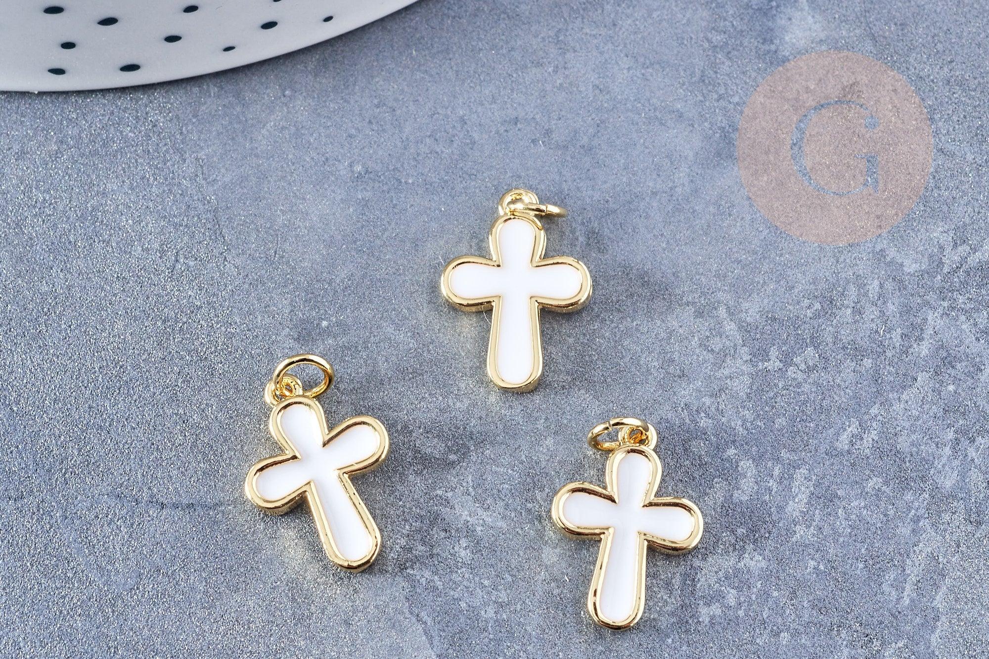 Este colgante de cruz de latón dorado y esmalte blanco es ideal para crear joyas DIY . Cada colgante está bañado en oro y adornado con una cruz de esmalte blanco, añadiendo un toque de elegancia a tus creaciones.