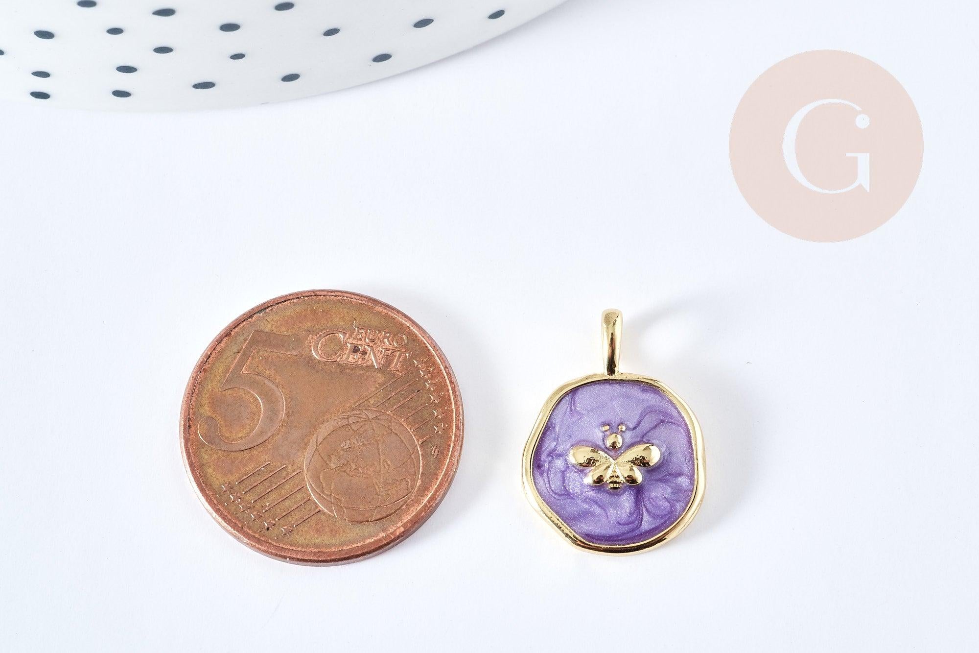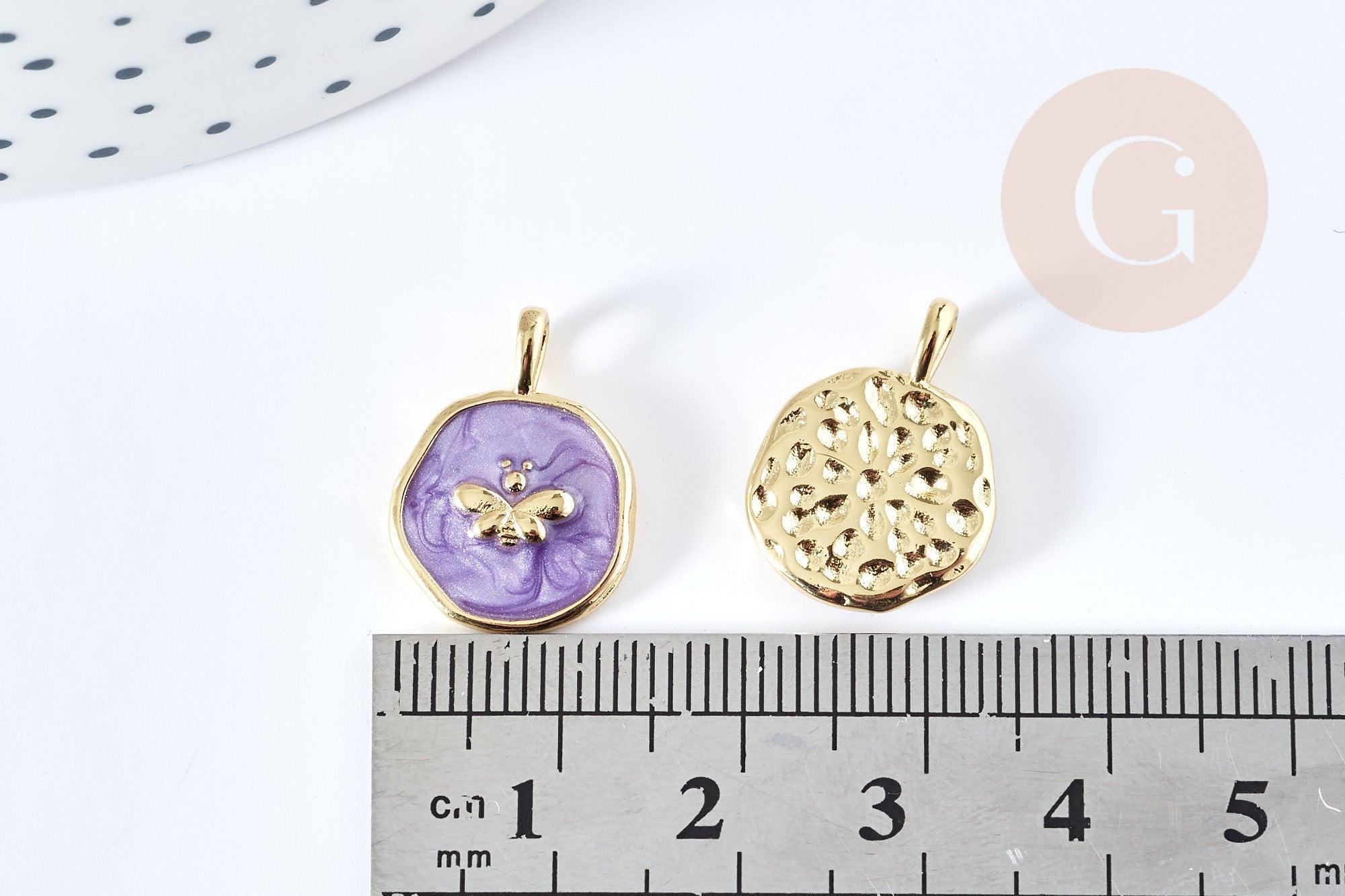Medallón colgante redondo mariposa esmalte oro violeta latón 18mm, colgante de latón esmaltado, sin níquel, x1 G8552