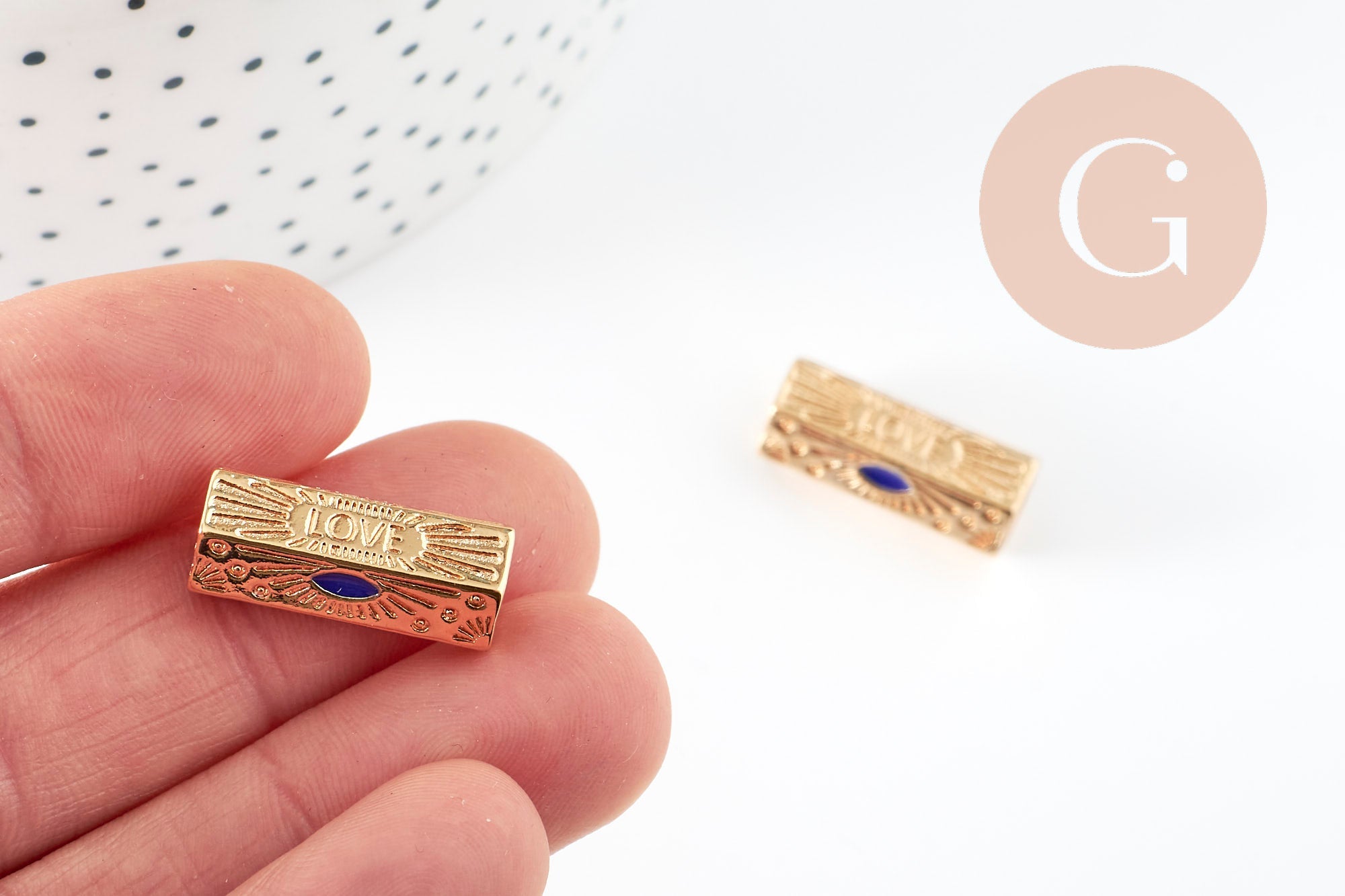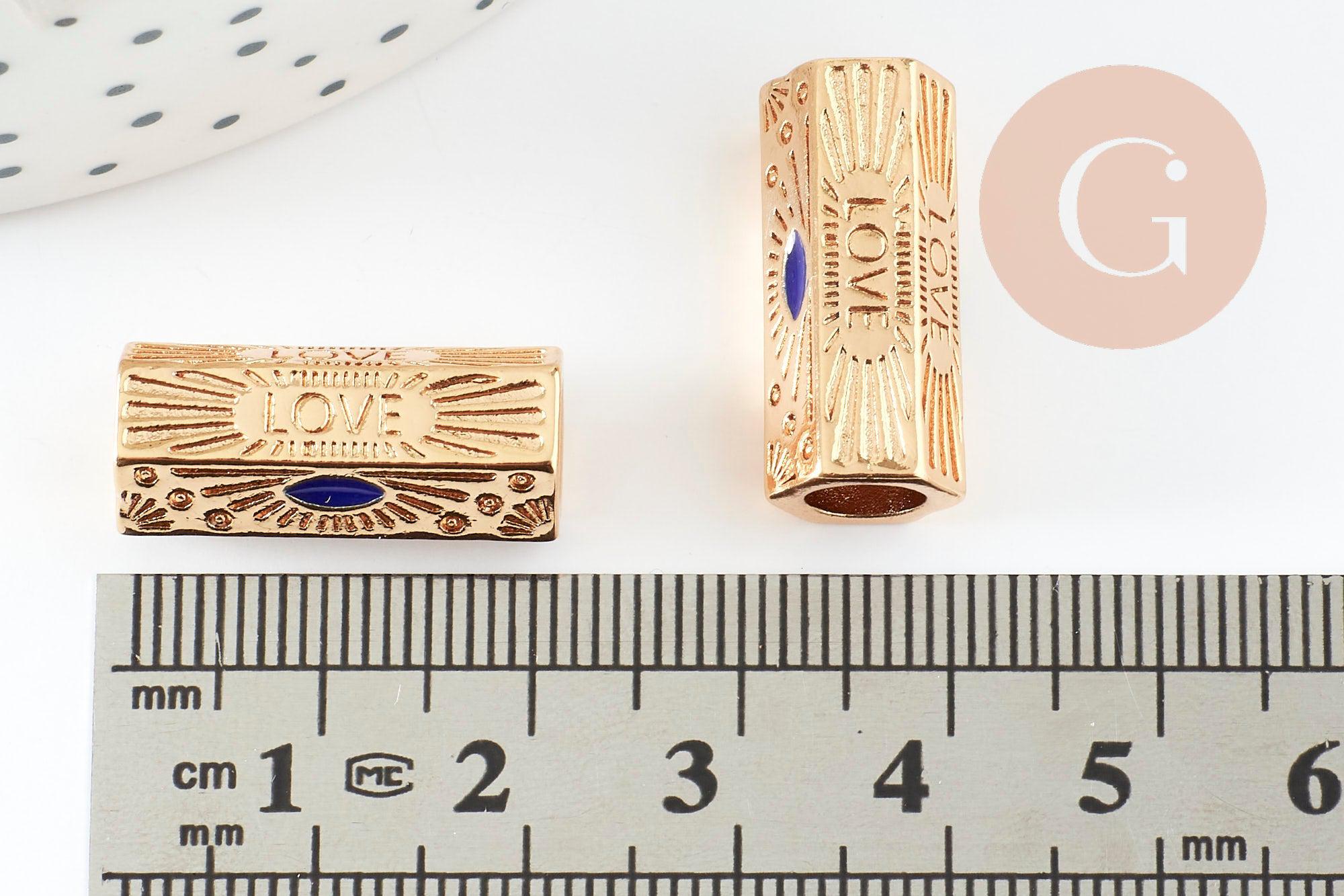 Perle tube talisman message LOVE doré couleur bleu 21mm, perle dorée bijoux amour, x1 G9408