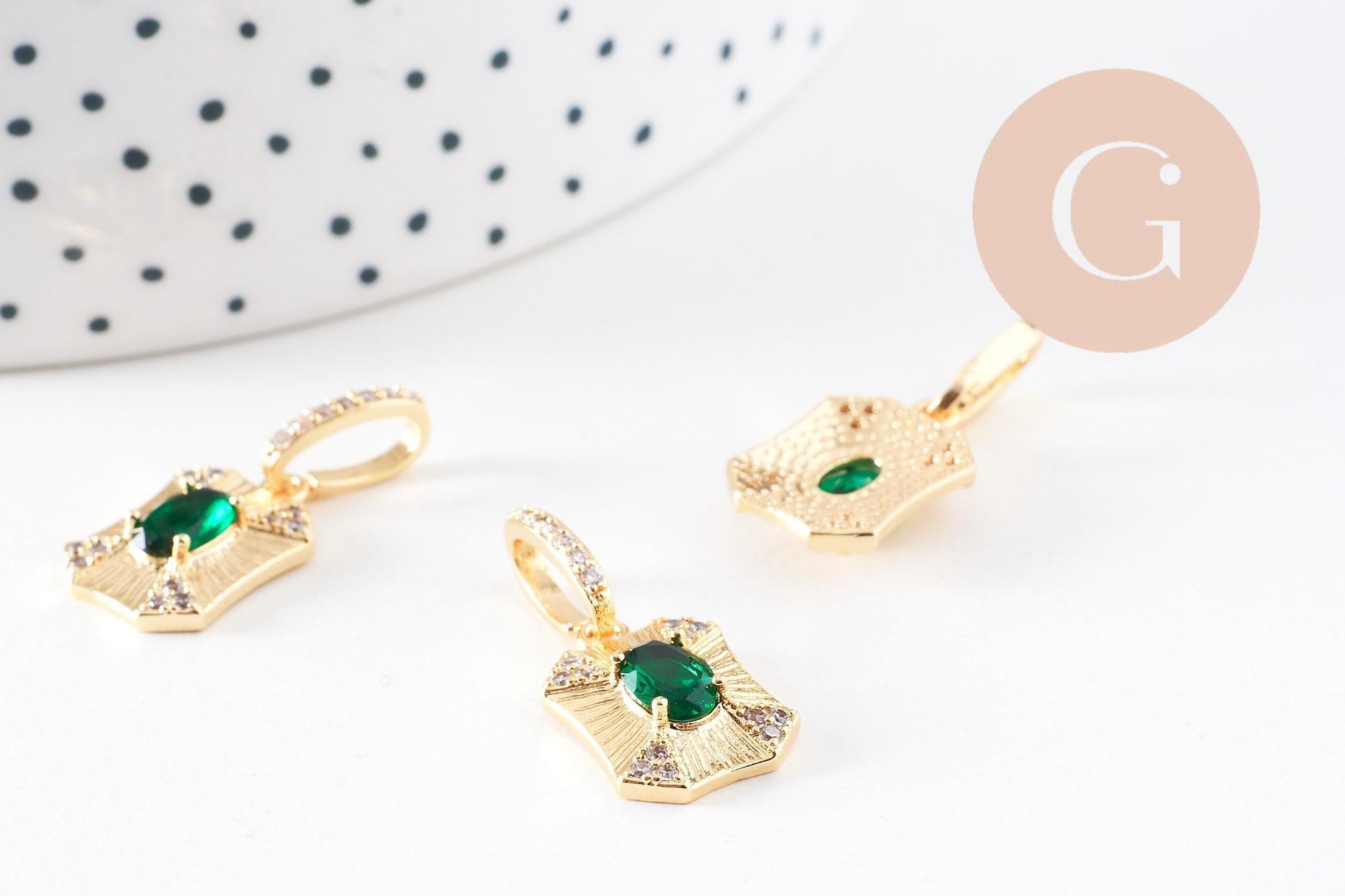 Sublime colgante octogonal en latón bañado en oro de 18 quilates , adornado con magníficas circonitas blancas y verdes , combinando elegancia y brillo.