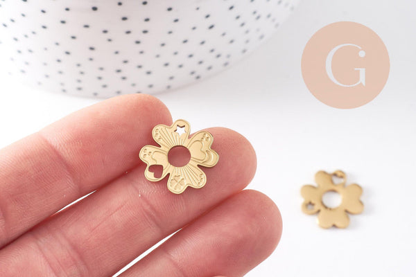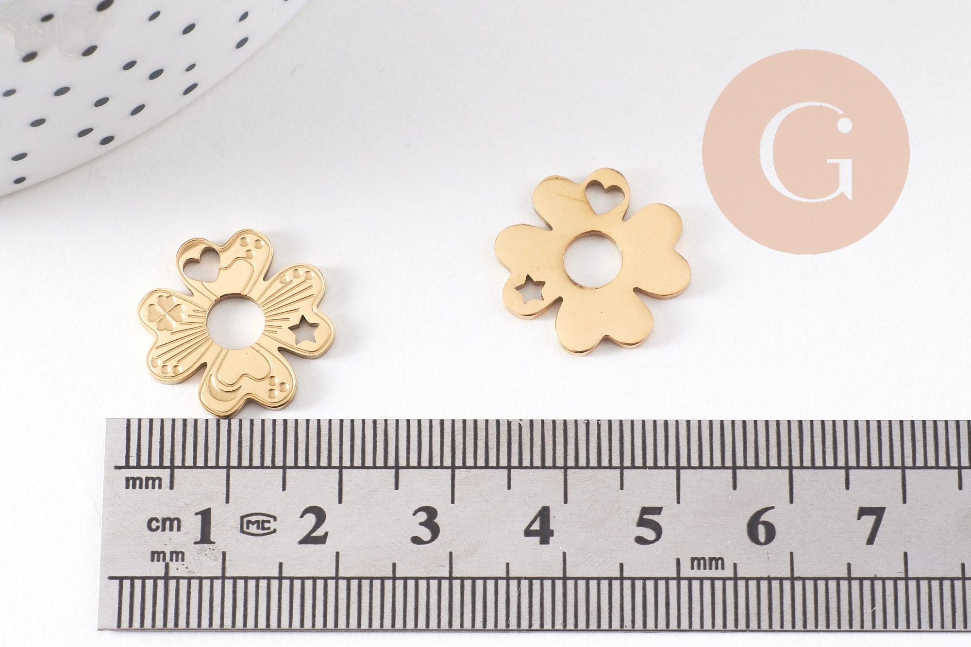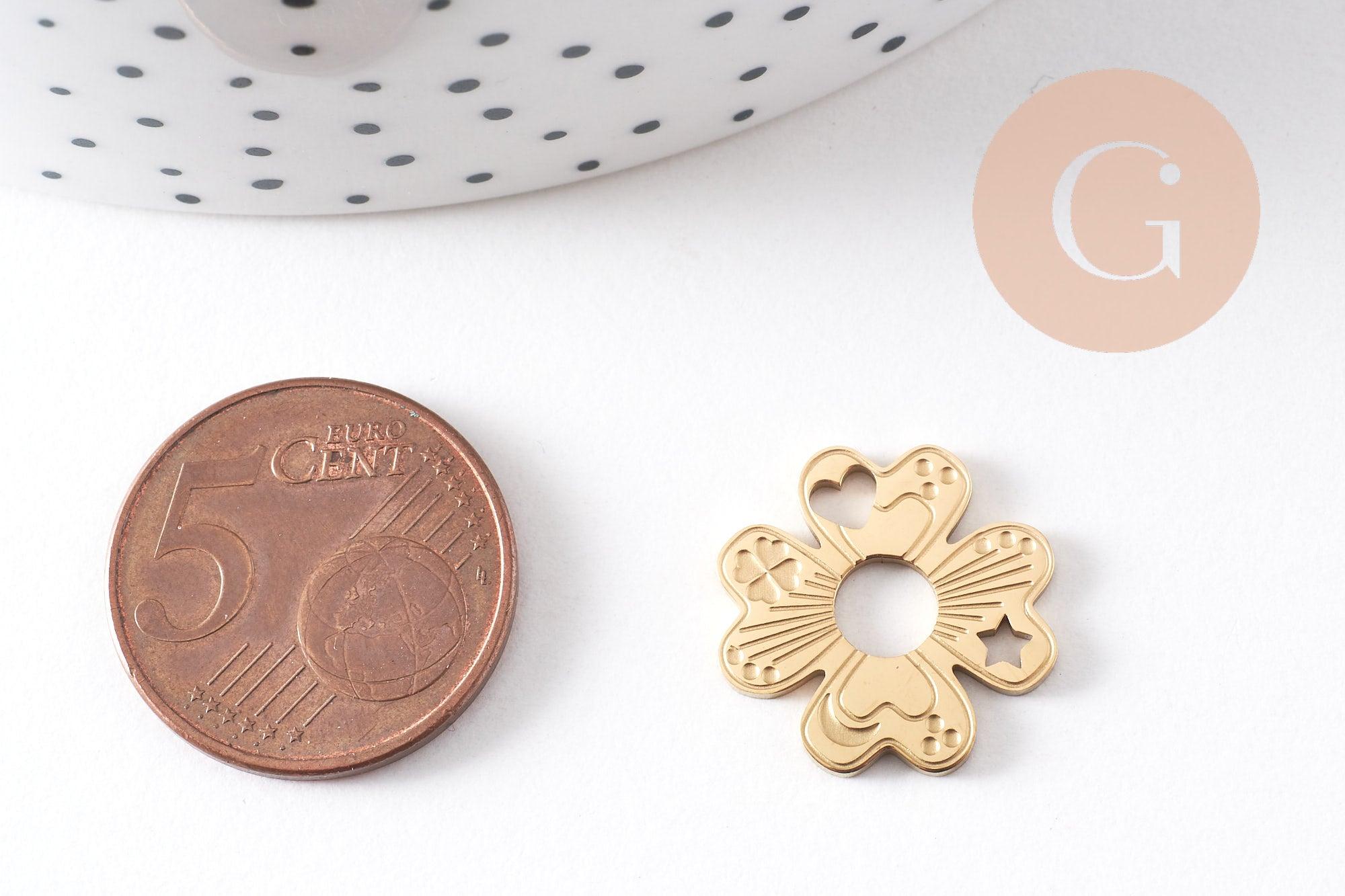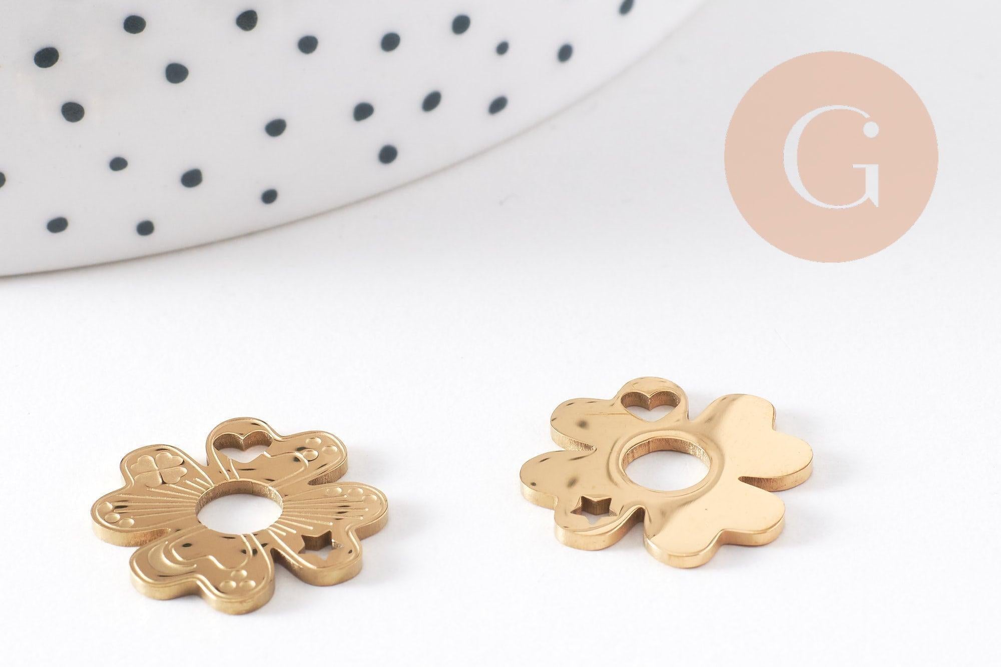 Este colgante de trébol de 4 hojas en acero inoxidable 316 con baño de oro IP está adornado con delicados motivos calados que representan símbolos de la suerte : corazones, lunas, estrellas y tréboles. Elegante y refinado, este colgante es ideal para crear joyas simbólicas, ya sea para regalar o para lucir a diario como talismán.
