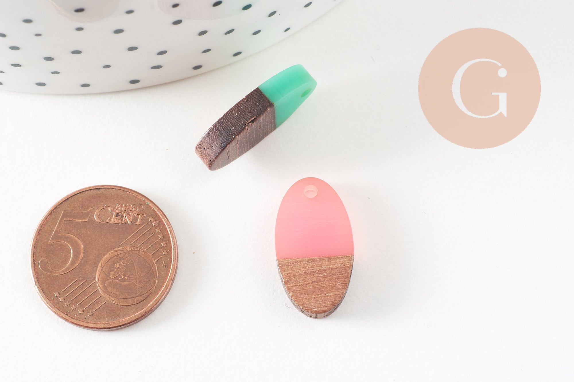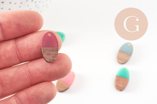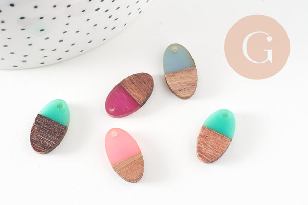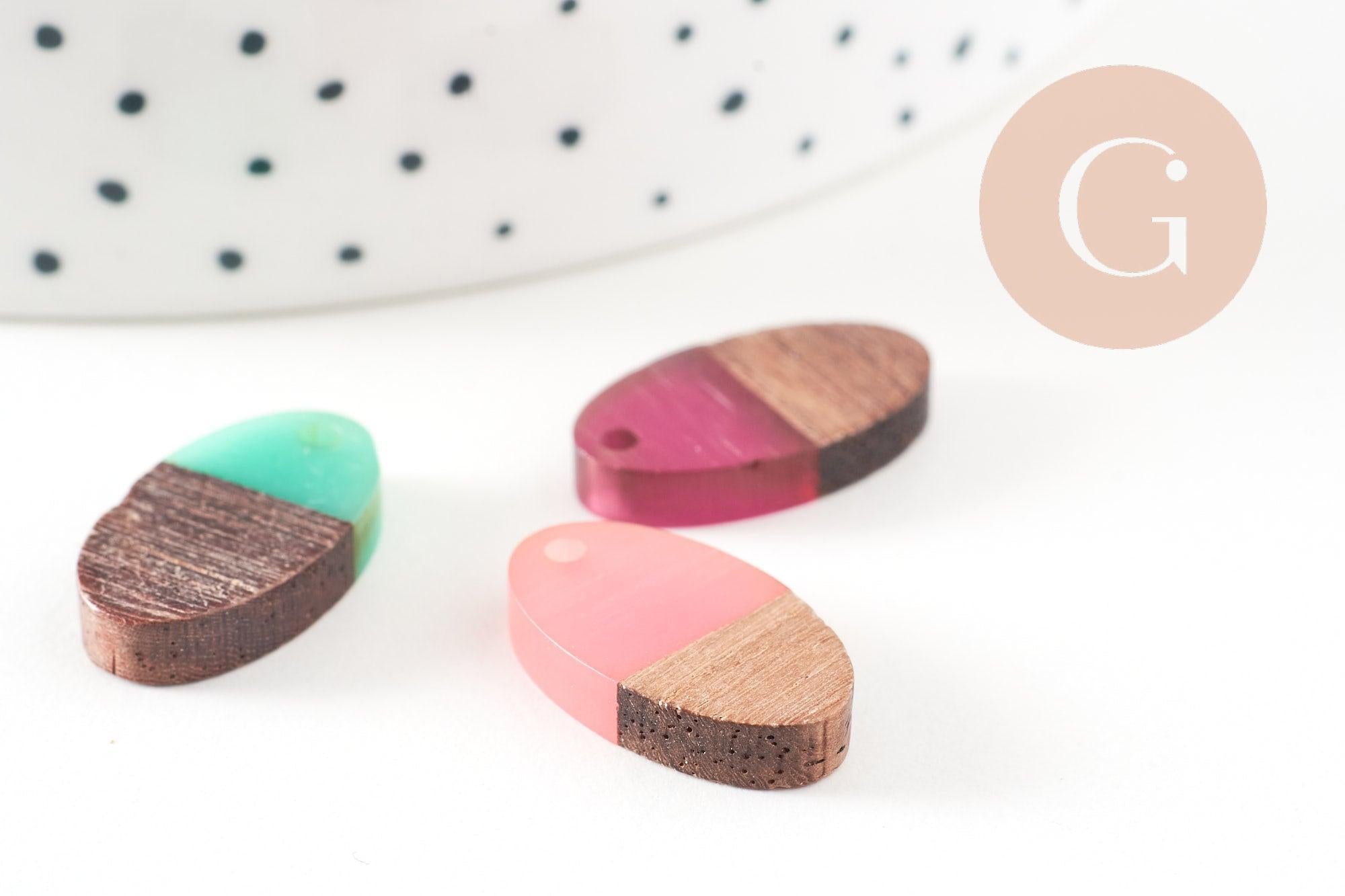Cuentas ovaladas de aspecto muy sencillo, realizadas en madera y resina, que permiten realizar colgantes muy bonitos o bucles completos de espíritu geométrico.