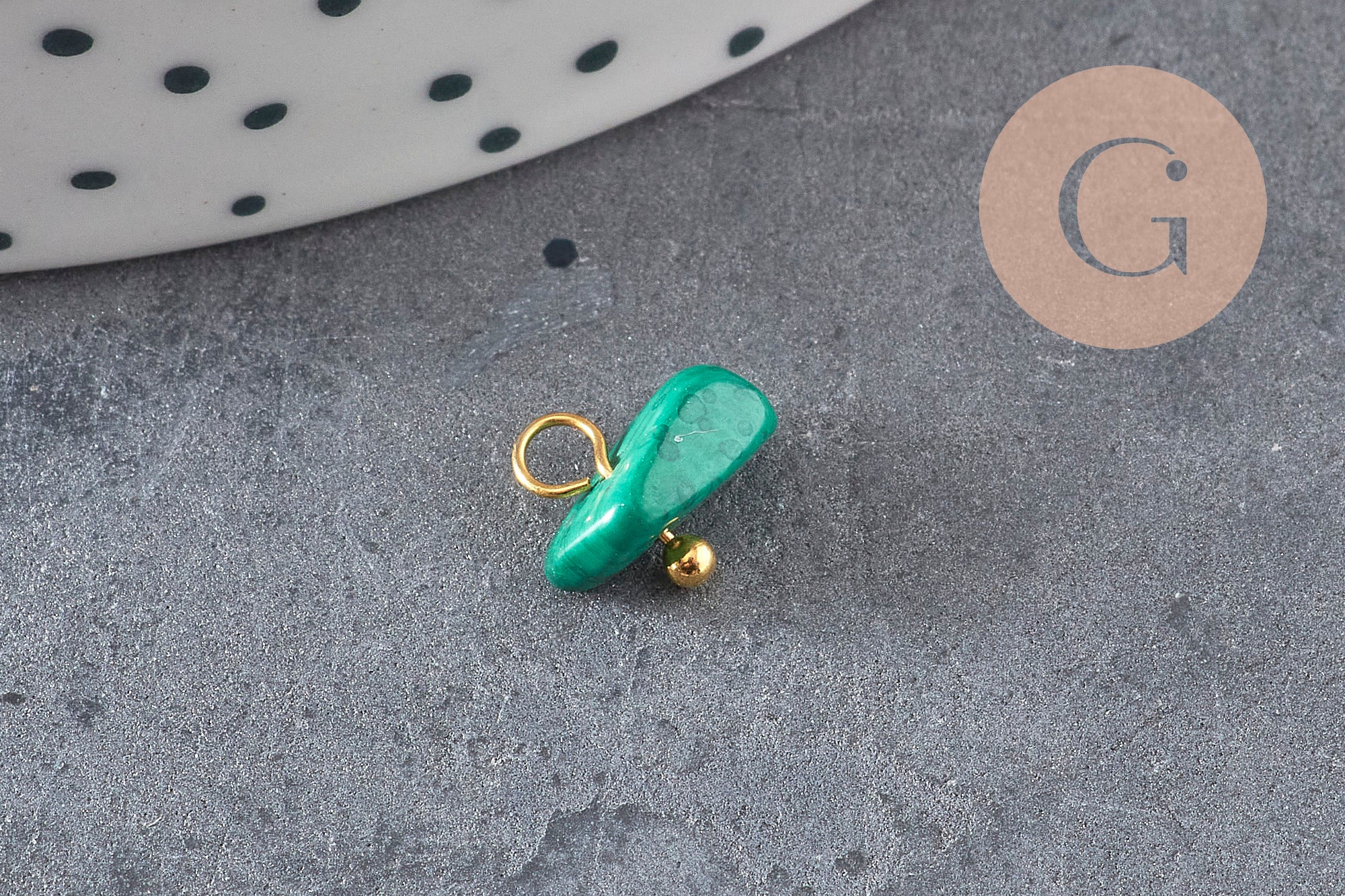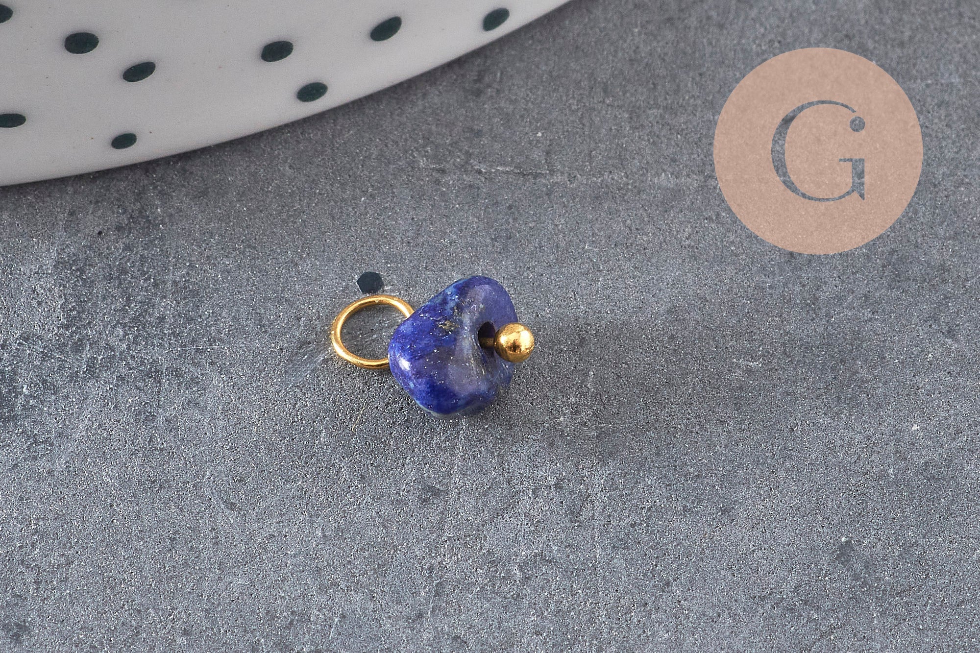 Añade un toque auténtico y elegante a tus creaciones con este dije de pepita de piedra natural , montado sobre una base de zamac chapada en oro . Cada pieza es única en forma y color, lo que da como resultado joyas refinadas con un aire natural.