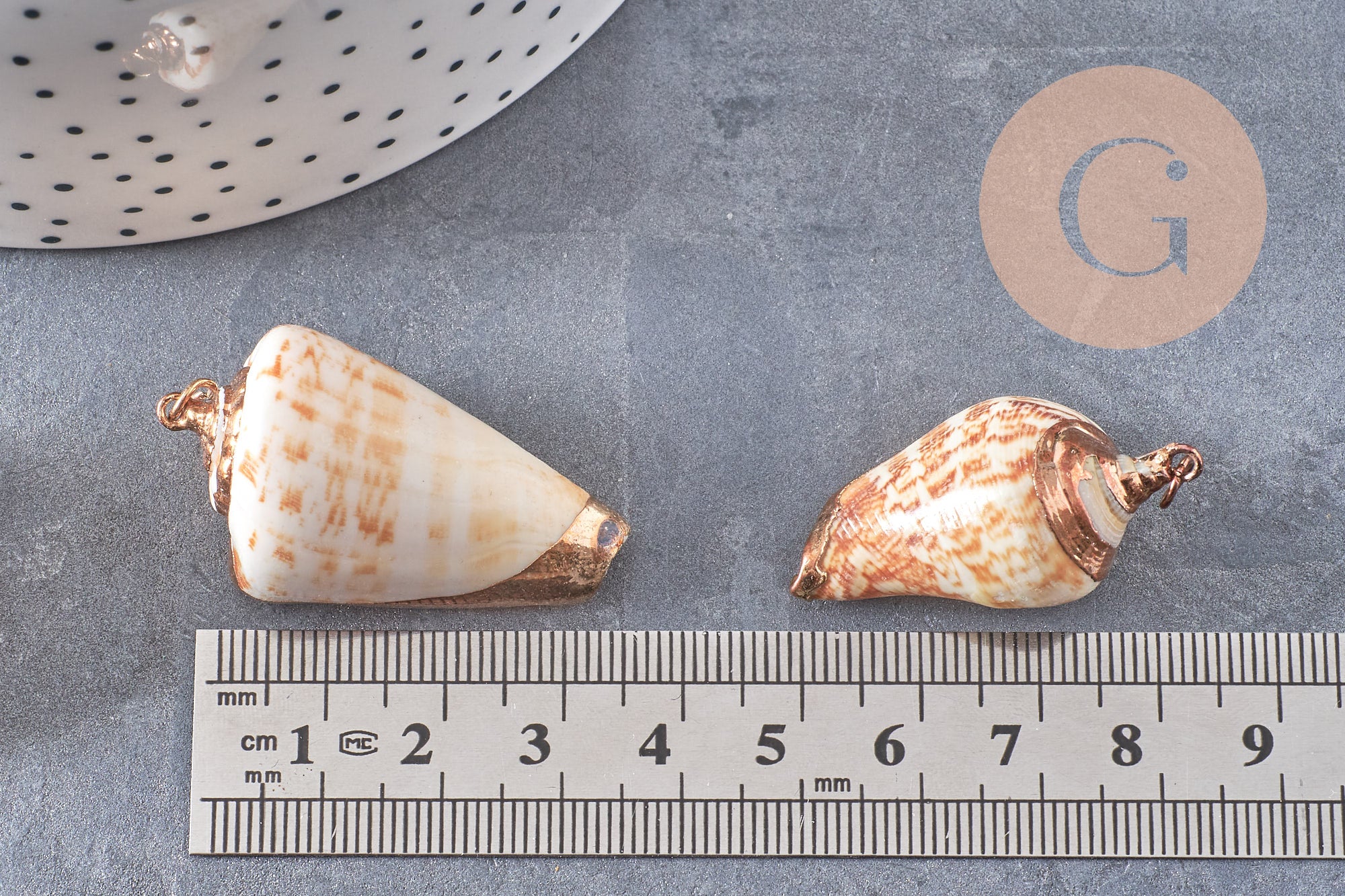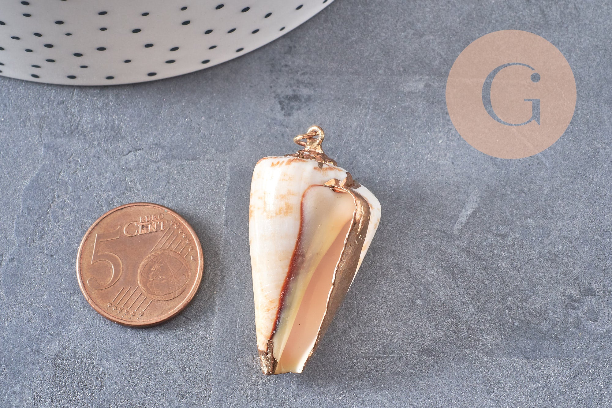 Un elegante colgante de concha natural dorada.
