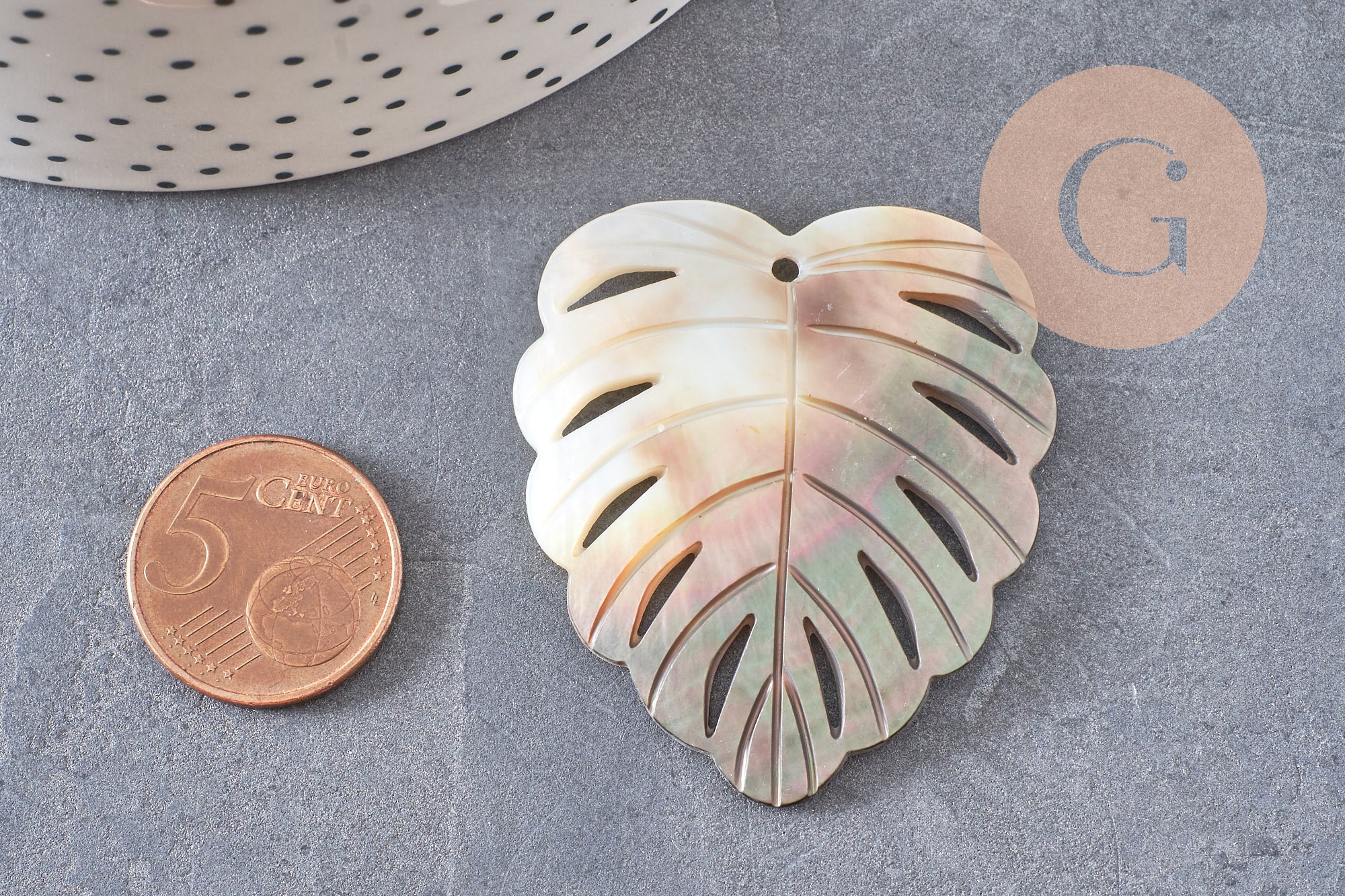 Añade un toque tropical y elegante a tus creaciones con este colgante de hoja de Monstera de nácar natural , en delicados tonos blanco perlado y gris .