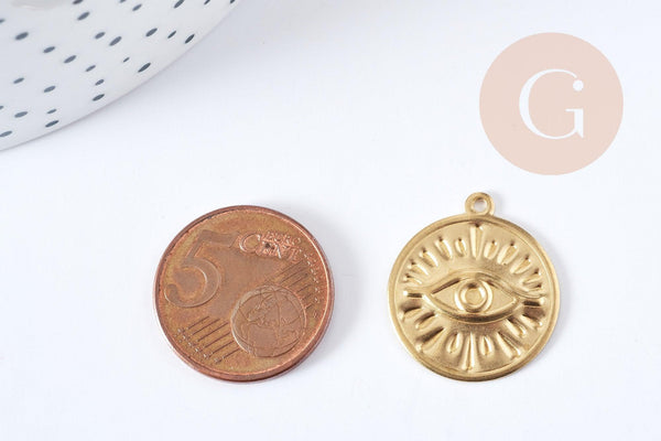 Colgante de medalla de ojo protector redondo de latón en bruto 23 mm, acabado dorado sin níquel, medalla de oro en latón en bruto, x1 G8822