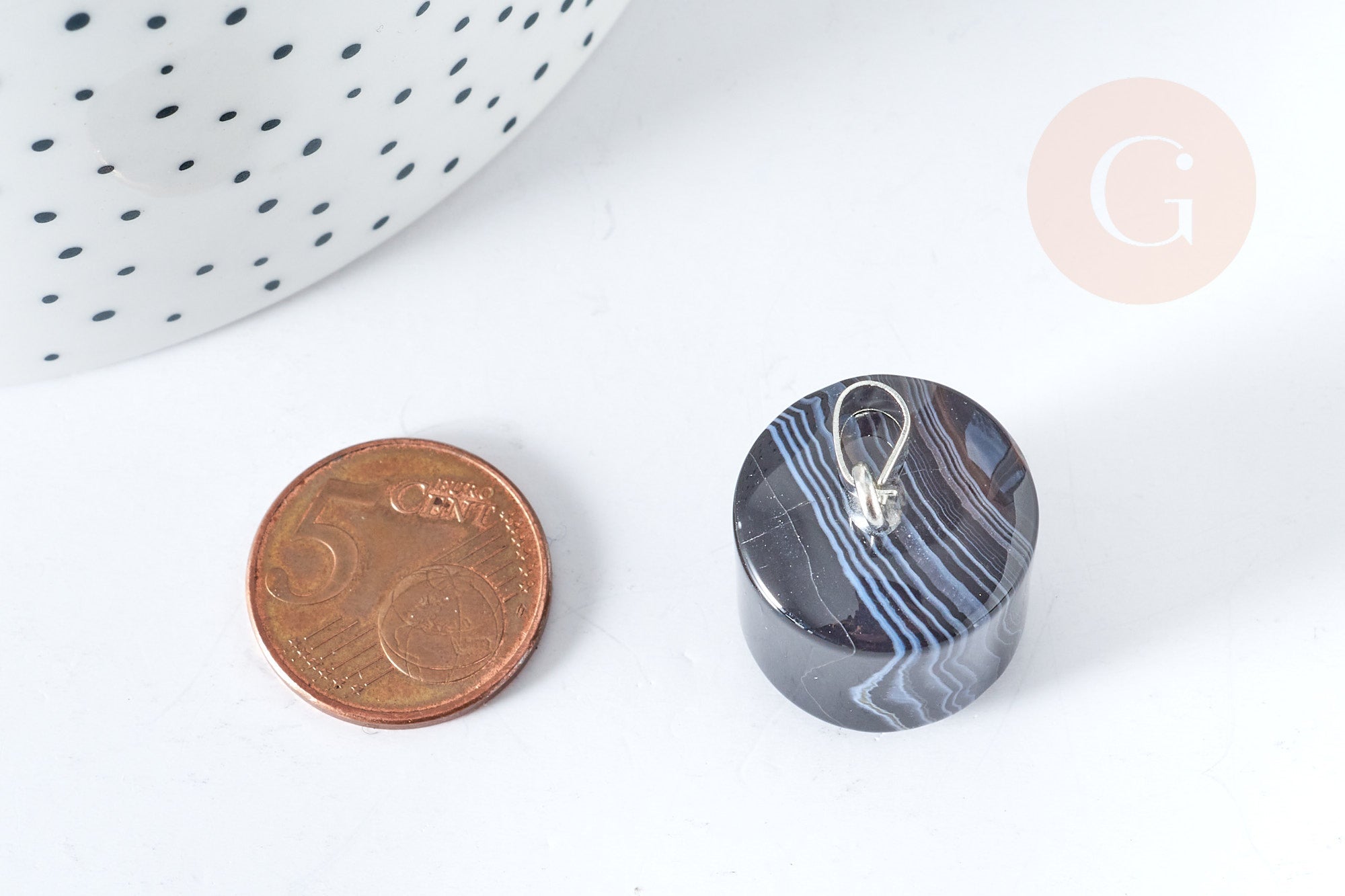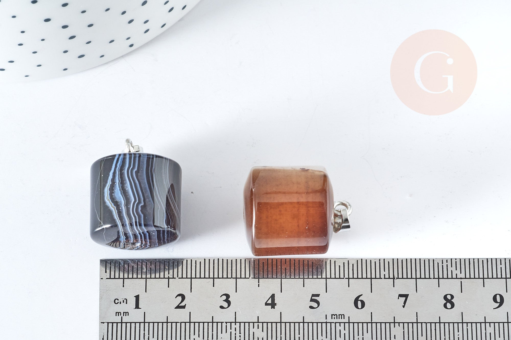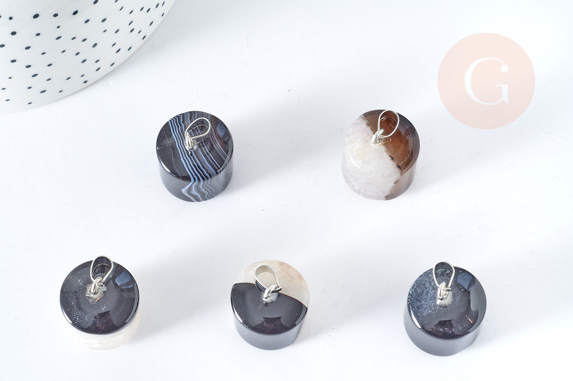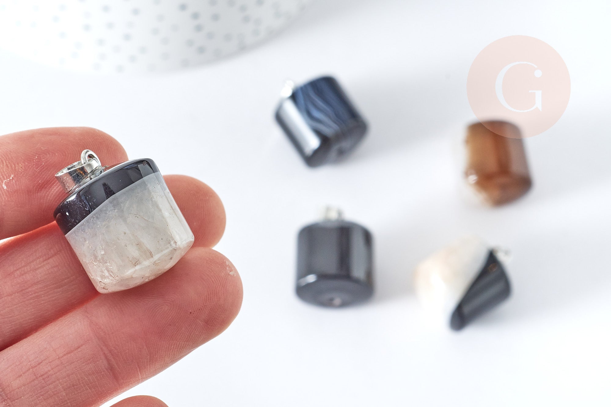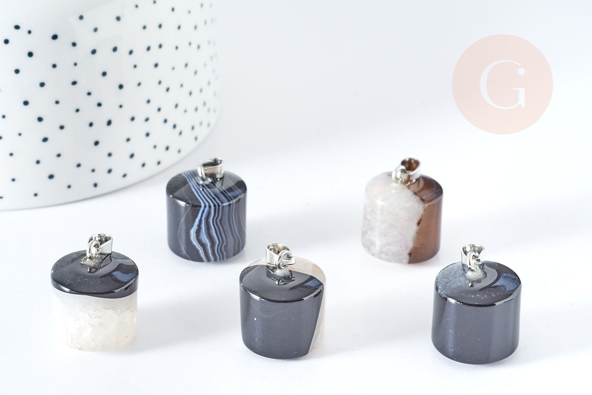 Este colgante cilíndrico de ágata rayada de platino gris hierro negro es una auténtica maravilla de la naturaleza. Tallado en una piedra natural de calidad , es único e ideal para crear joyas refinadas y originales.