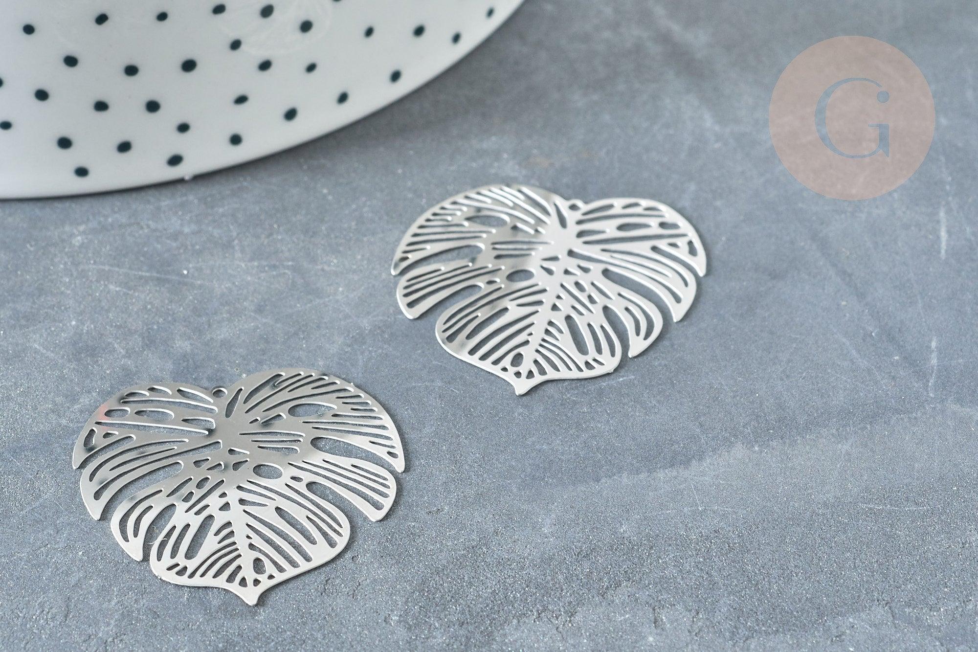 Colgante de filigrana de hojas tropicales en acero inoxidable 201 platino, 32 mm (x2) (G8015)