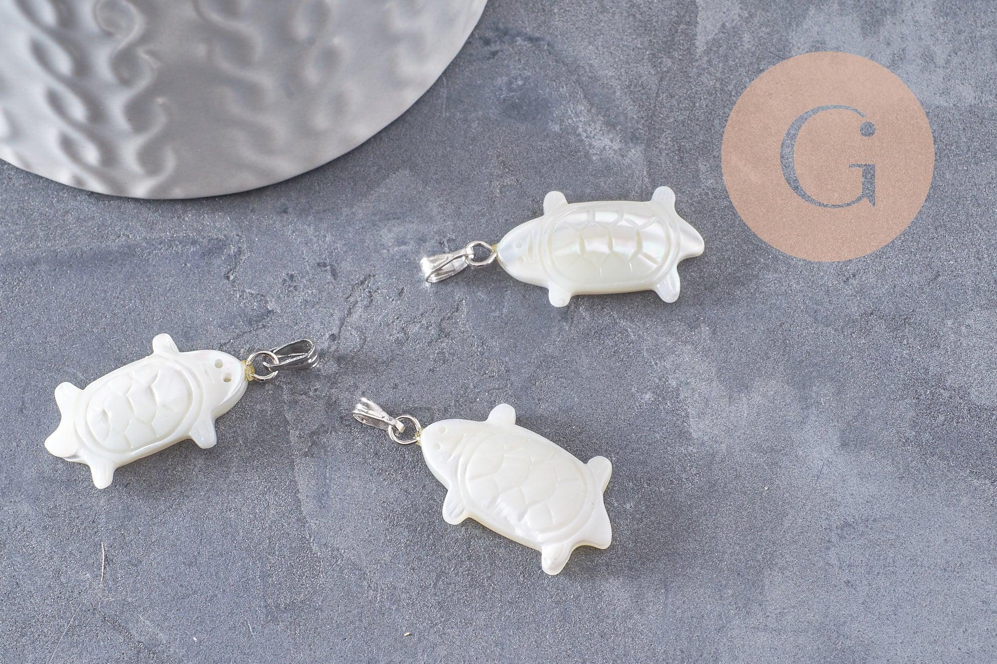 Colgante tortuga de nácar blanco natural, latón platino 26-27 mm, creación de joyería de concha blanca, x1 (G9919)