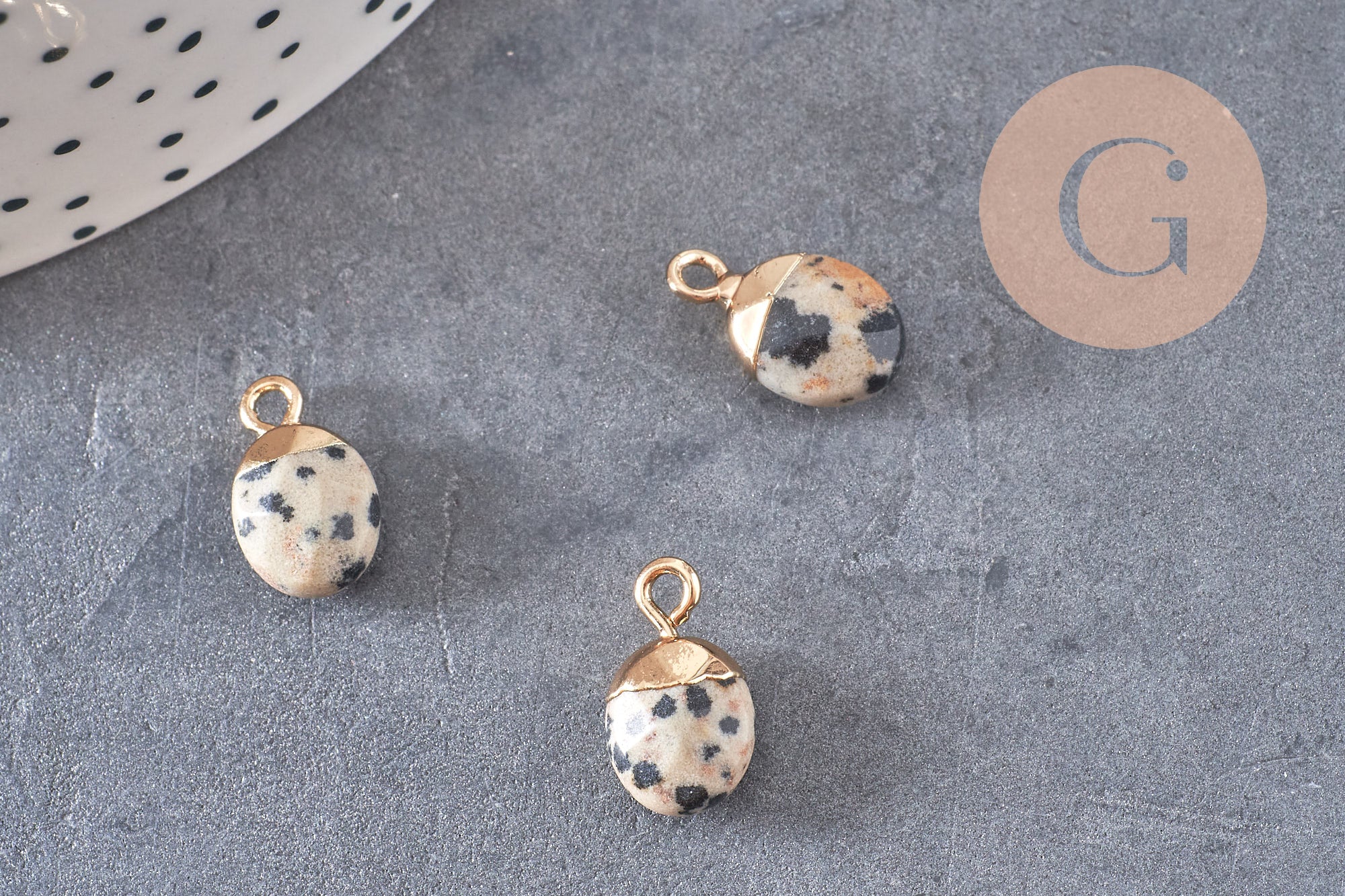 Déjate seducir por este pequeño colgante muy discreto de jaspe dálmata natural con su soporte de hierro dorado.