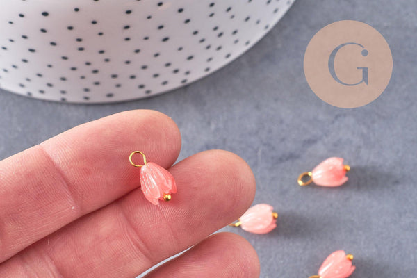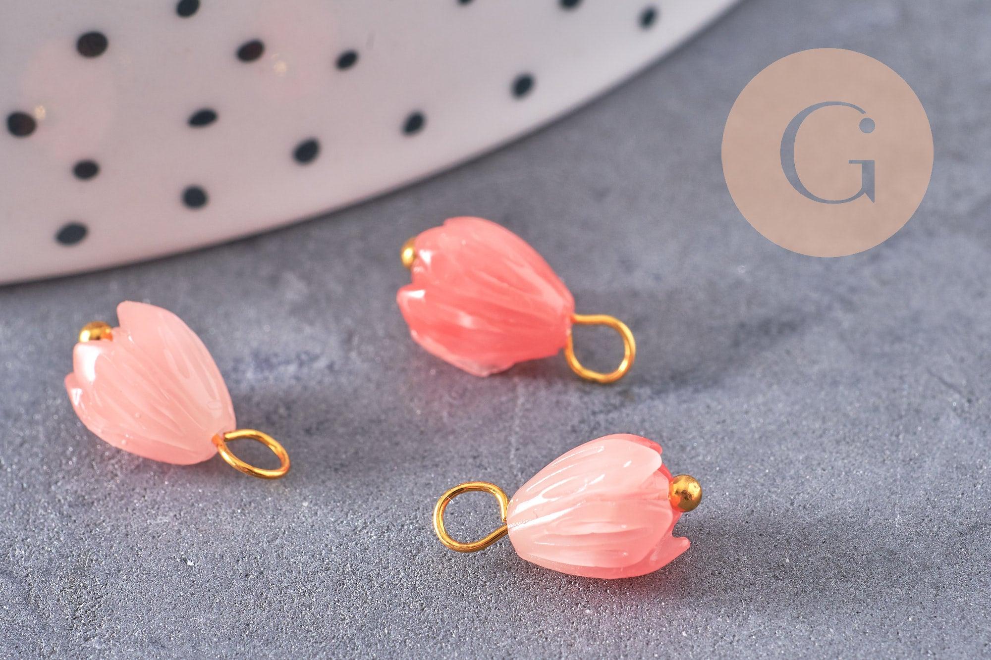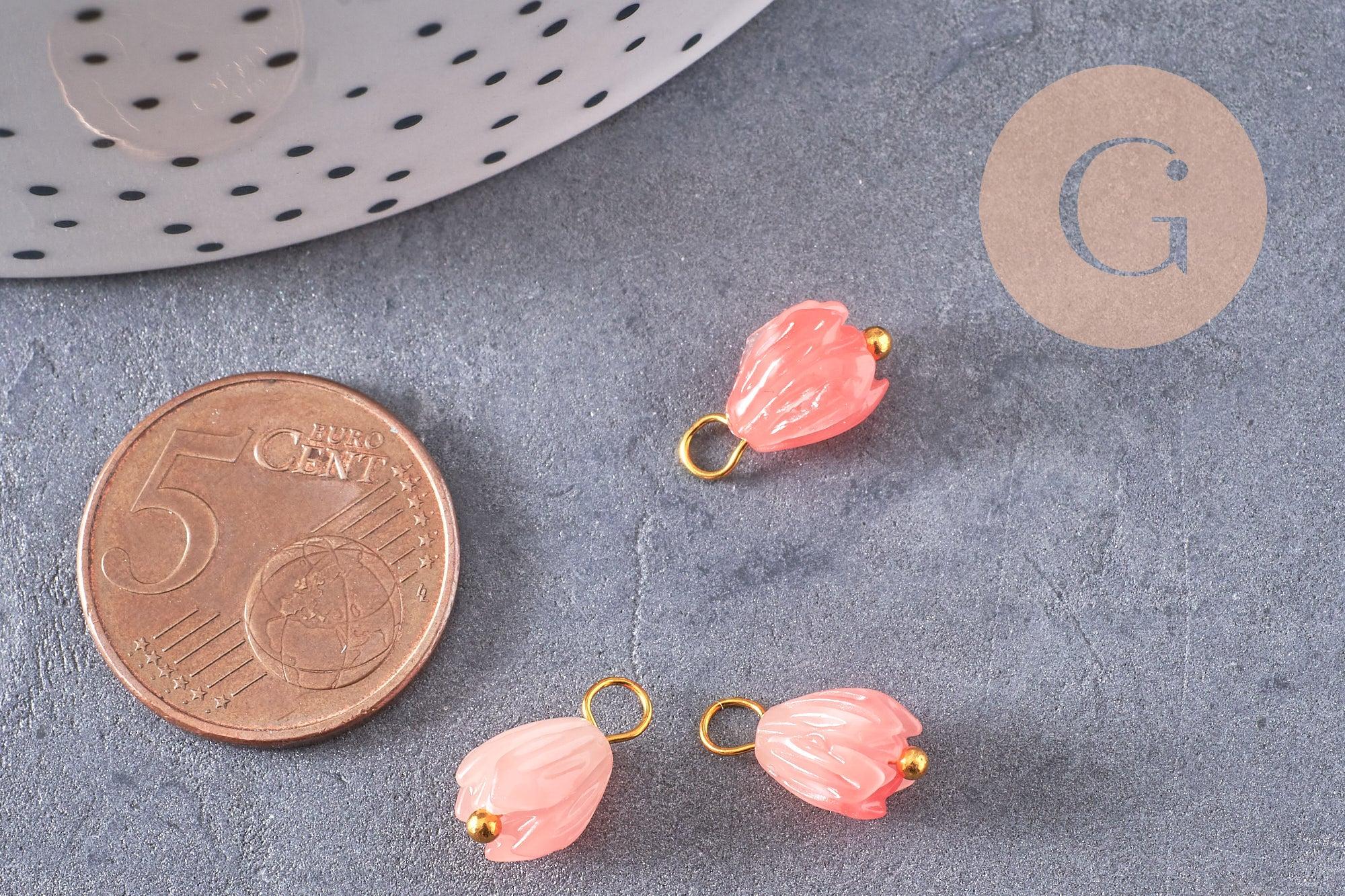 Colgante de flor de resina rosa en latón bañado en oro de 13 mm, colgante de capullo de flor, x10 (G7087)