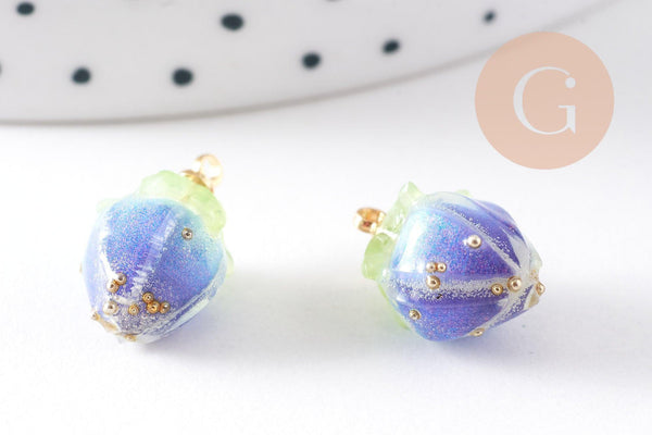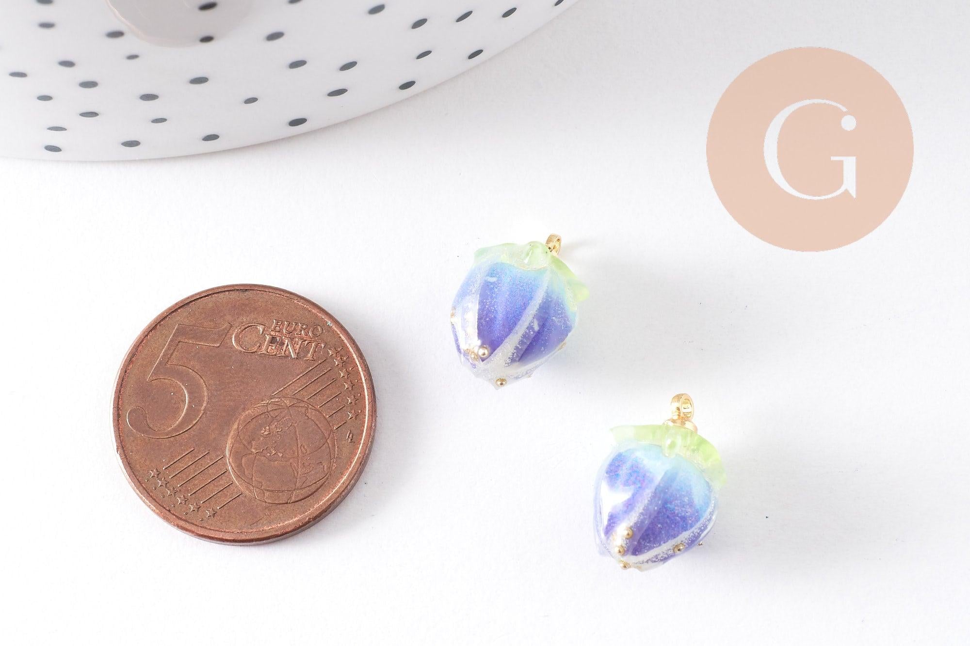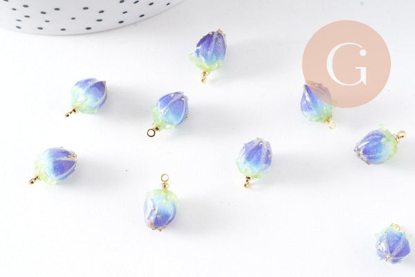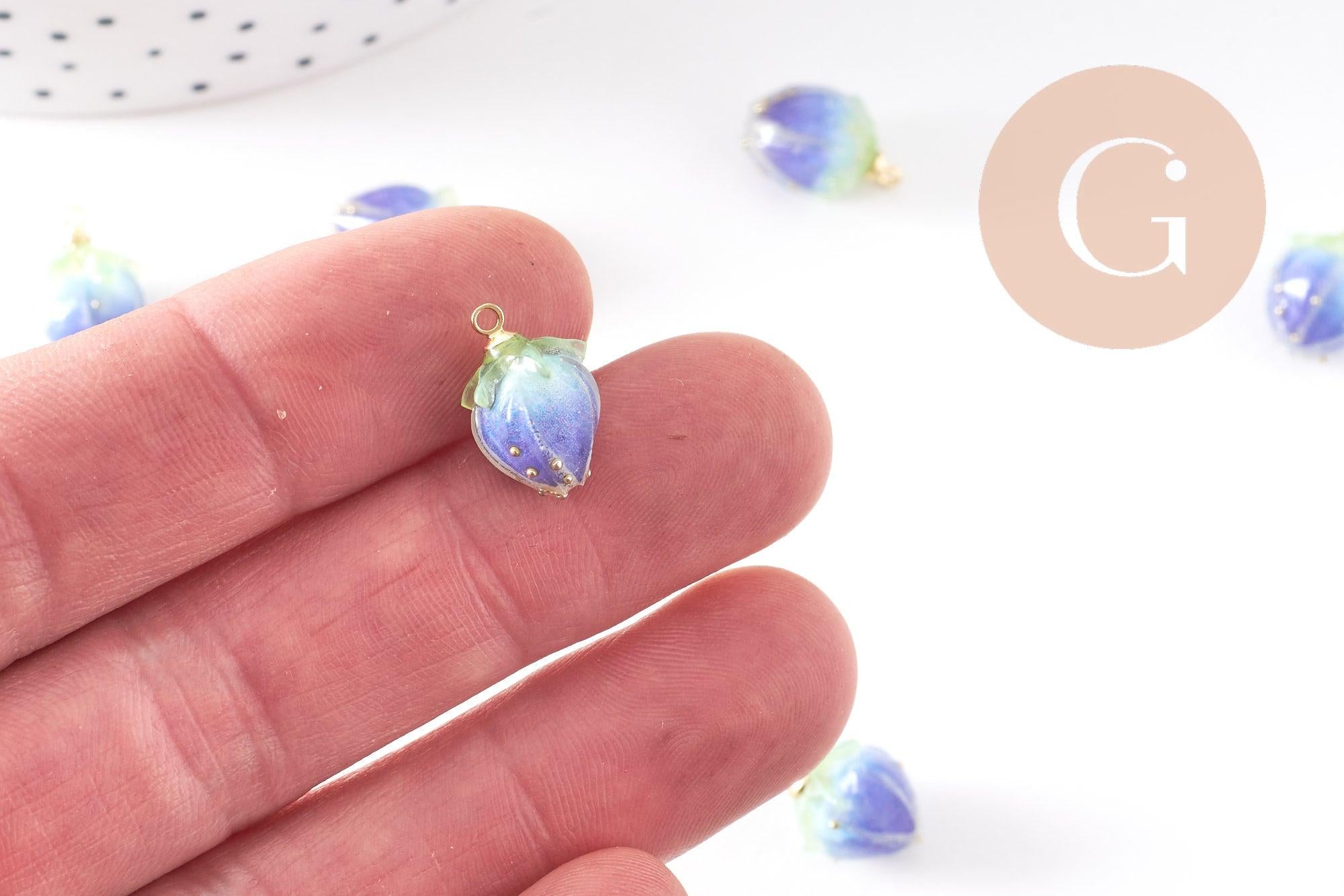 Colgante hecho a mano de flor seca (rosa azul), recubierto de resina epoxi transparente, compuesto por un pasador de latón dorado y decorado con microperlas de vidrio plateado.