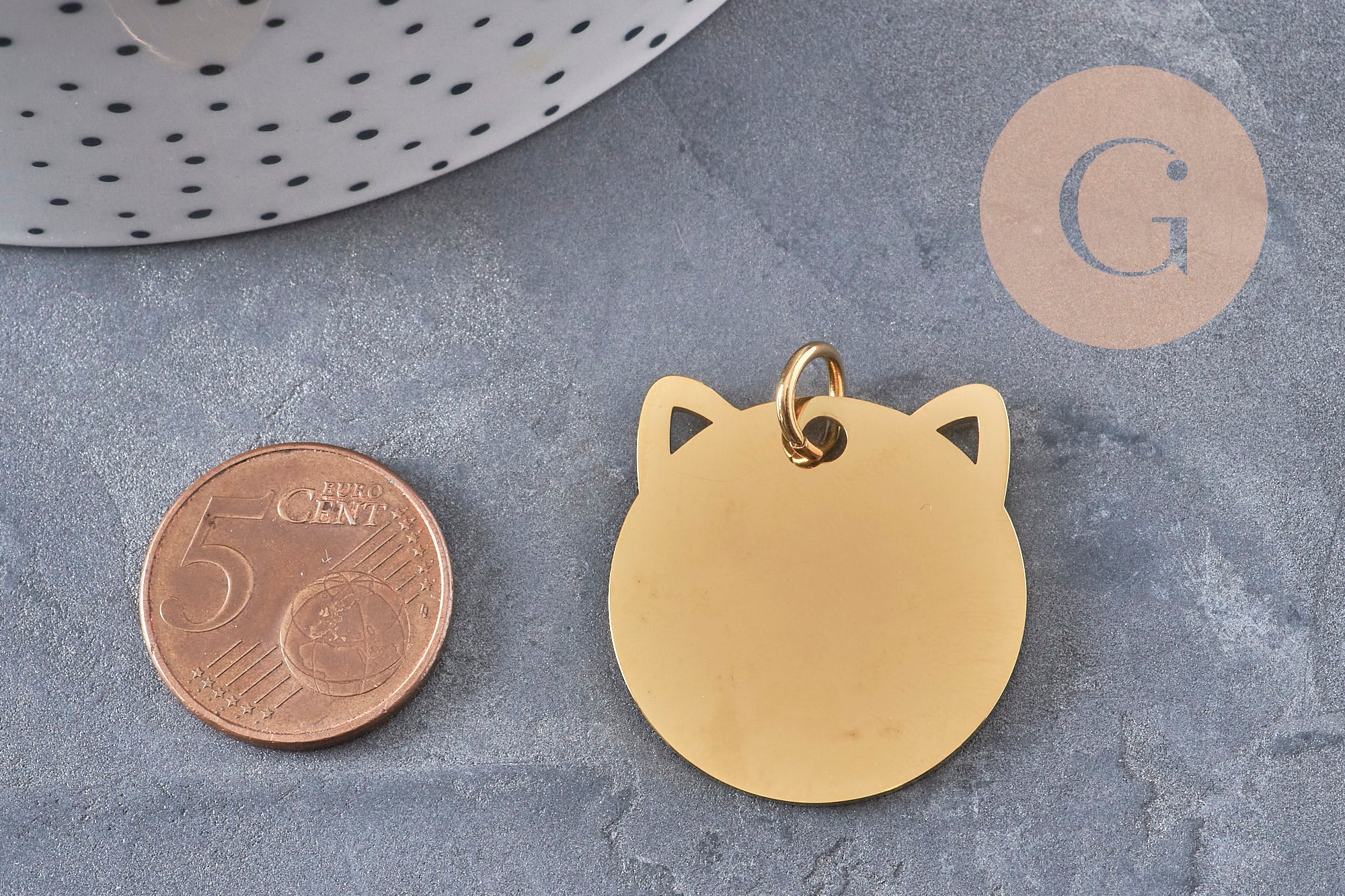Pendentif tête de chat acier 201 inoxydable doré 29mm personnalisable, x1 VALIDE